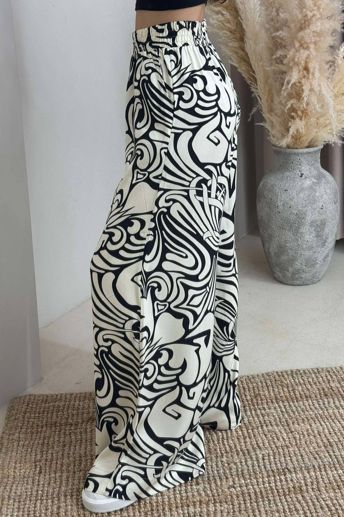 ABSTRACT DESIGN WIDE LEG WOMEN TROUSERS CREAM+BLACK/KREM+ZEZE