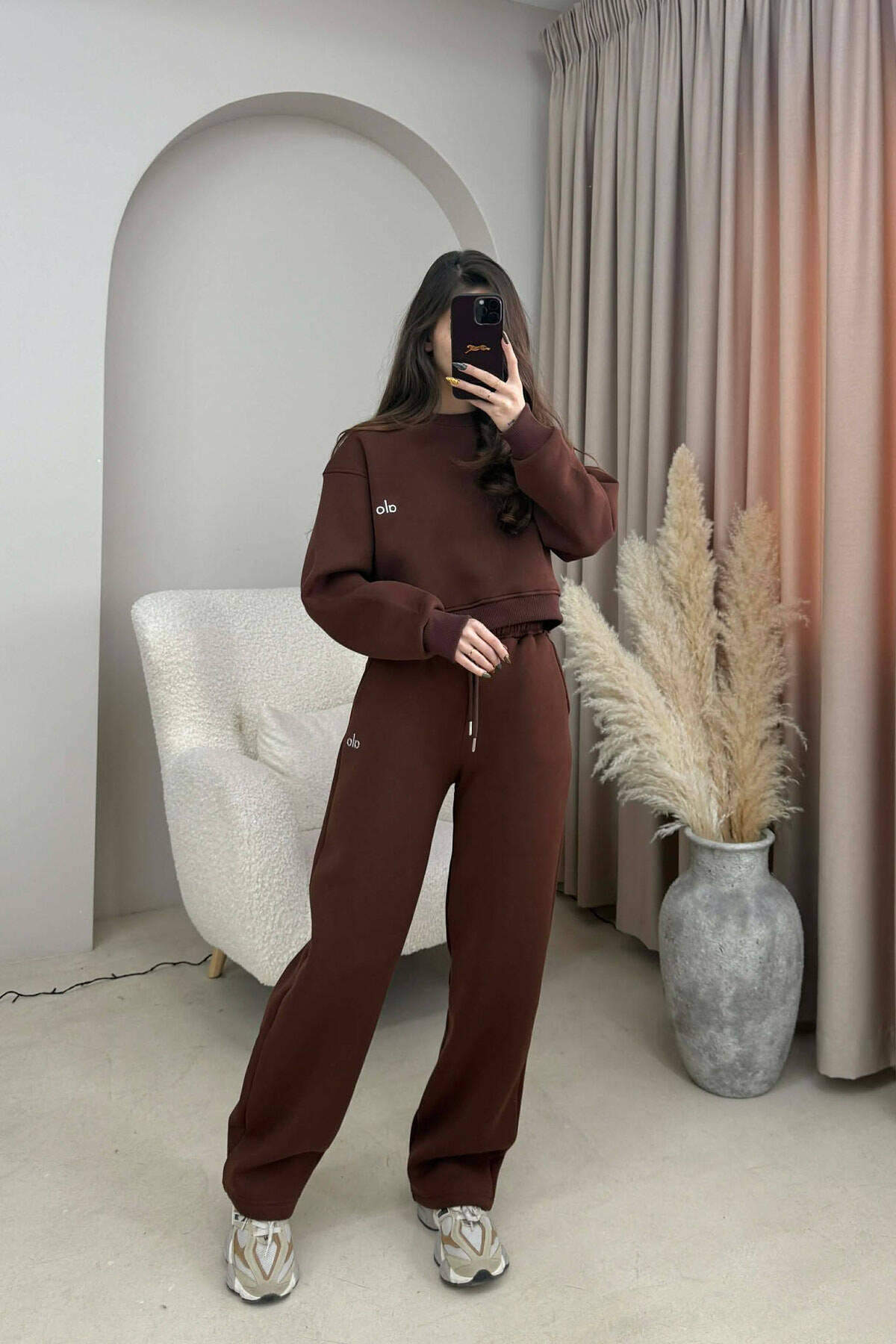 KOSTUM ALO ME PUSH BLUZË E SHKURTËR+TUTA PËR FEMRA NË NGJYRË KAFE