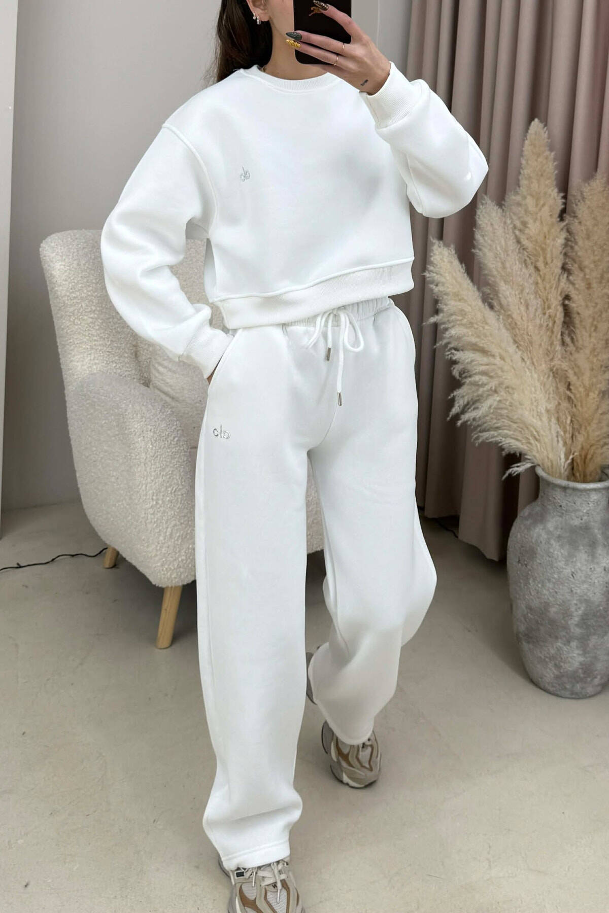 ALO CROPPED SWEATSHIRT+SWEATPANTS FLUFFY WOMEN SET WHITE-E BARDHE