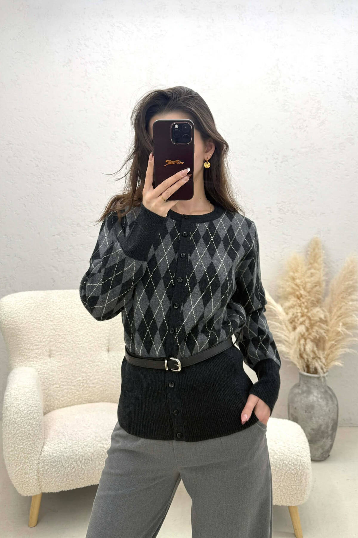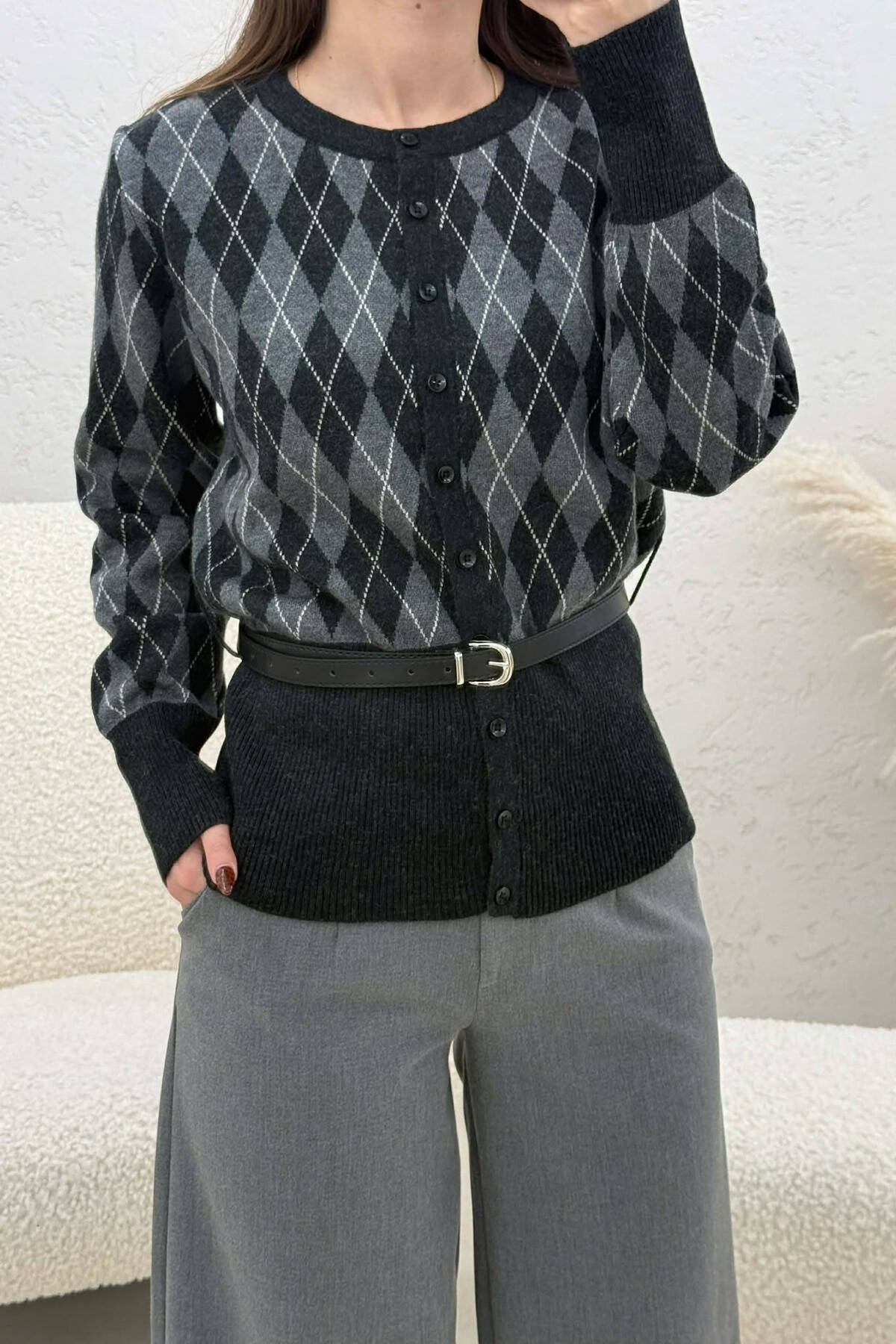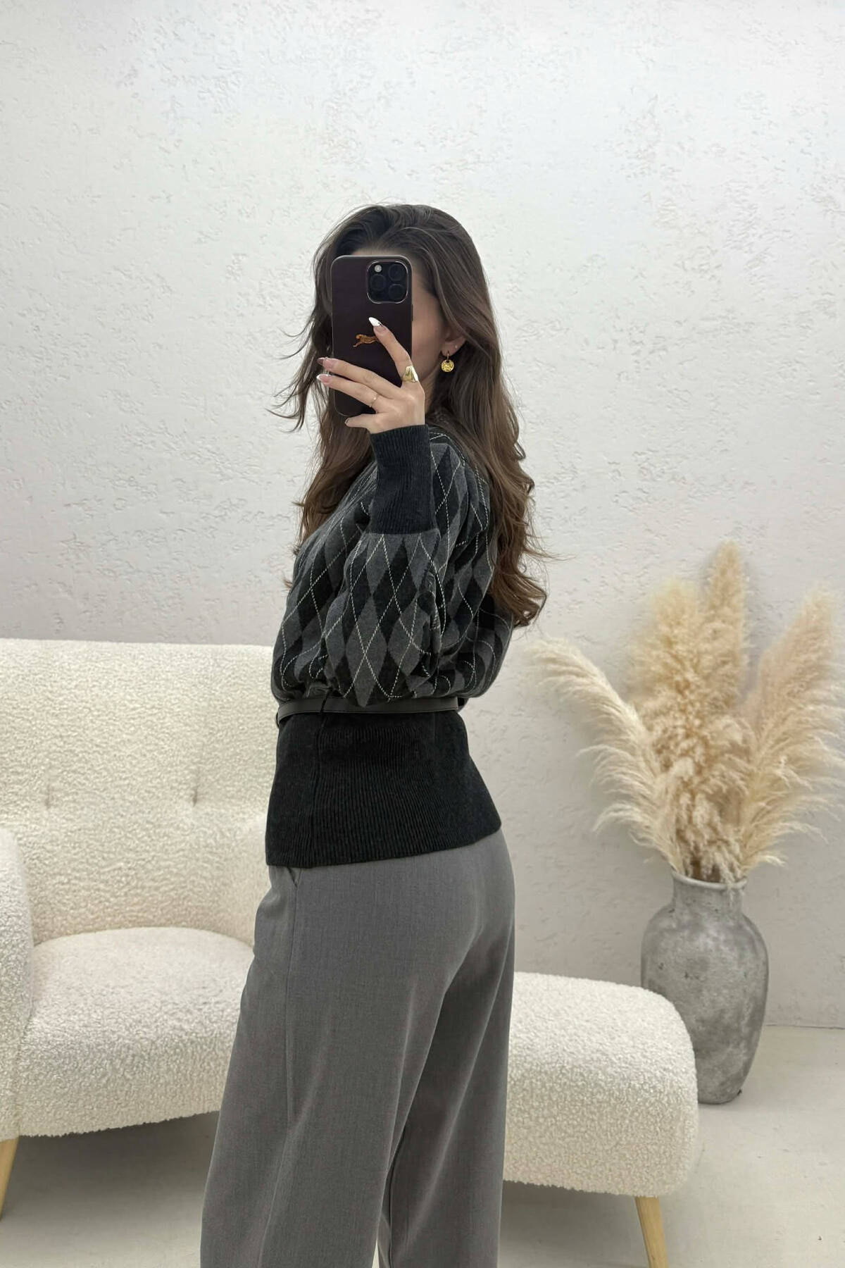 PULOVER ME KOPSA DHE DIZAJN ROMBESH PER FEMRA NE NGJYRE GRI TE ERRET