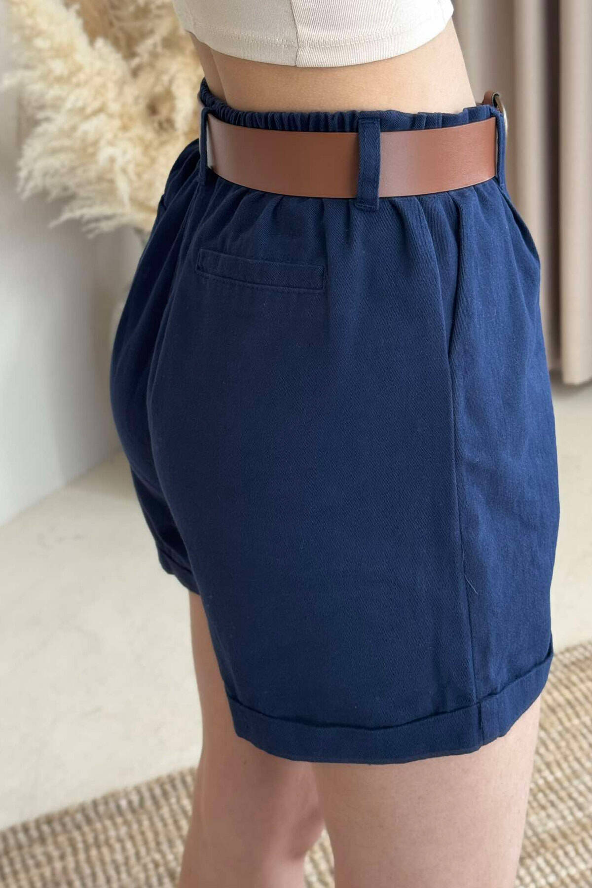 BELT DETAIL ONE COLOR WOMEN SHORTS DARK BLUE/BEE