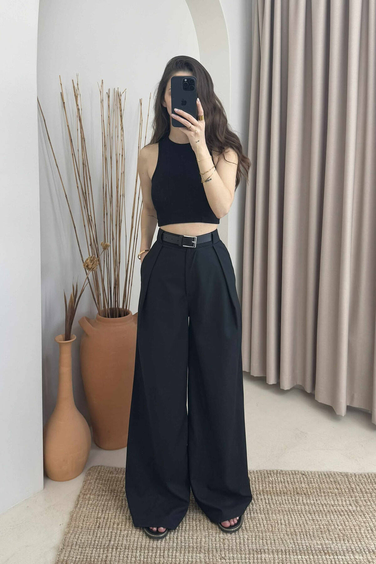 BELT DETAIL WIDE LEG WOMEN TROUSERS BLACK/ E ZEZE