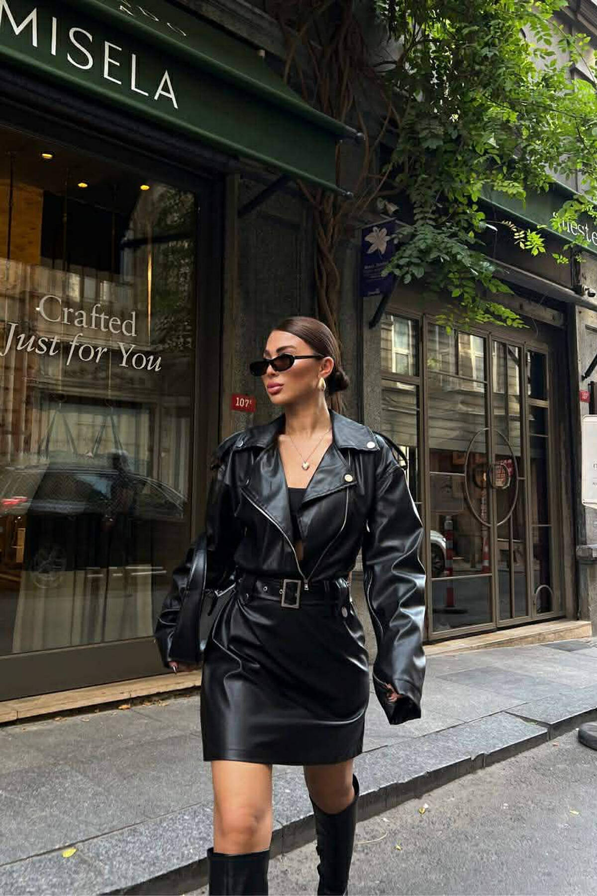 BELT DETAIL ZIPPERED SHORT LEATHER WOMEN DRESS BLACK/ E ZEZE