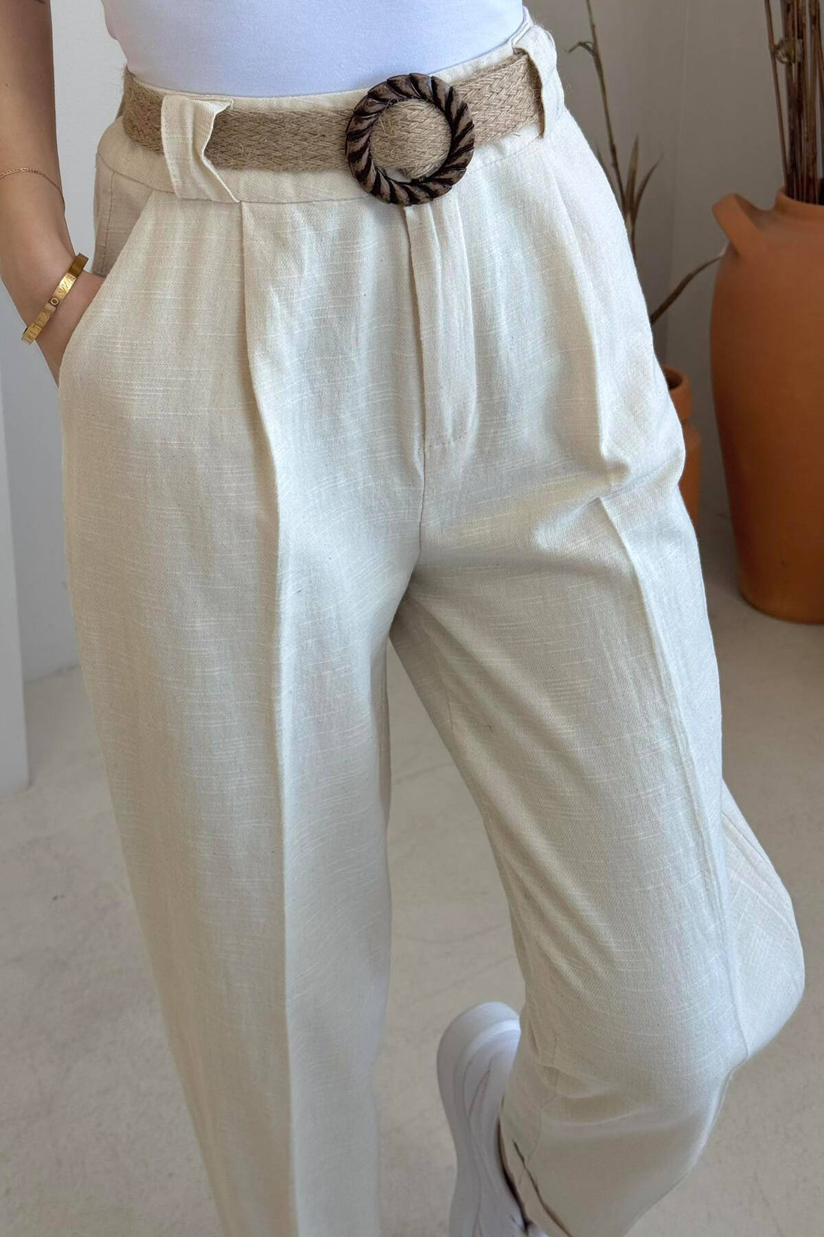 BELT LINEN ONE COLOR WOMEN TROUSERS CREAM/KREM