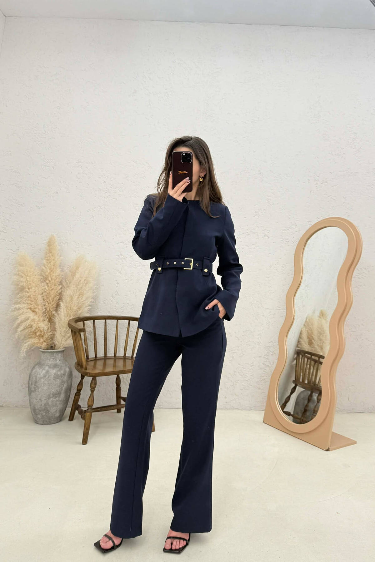 BELT ONE COLOR JACKET+TROUSERS WOMEN SET BLUE/BLU