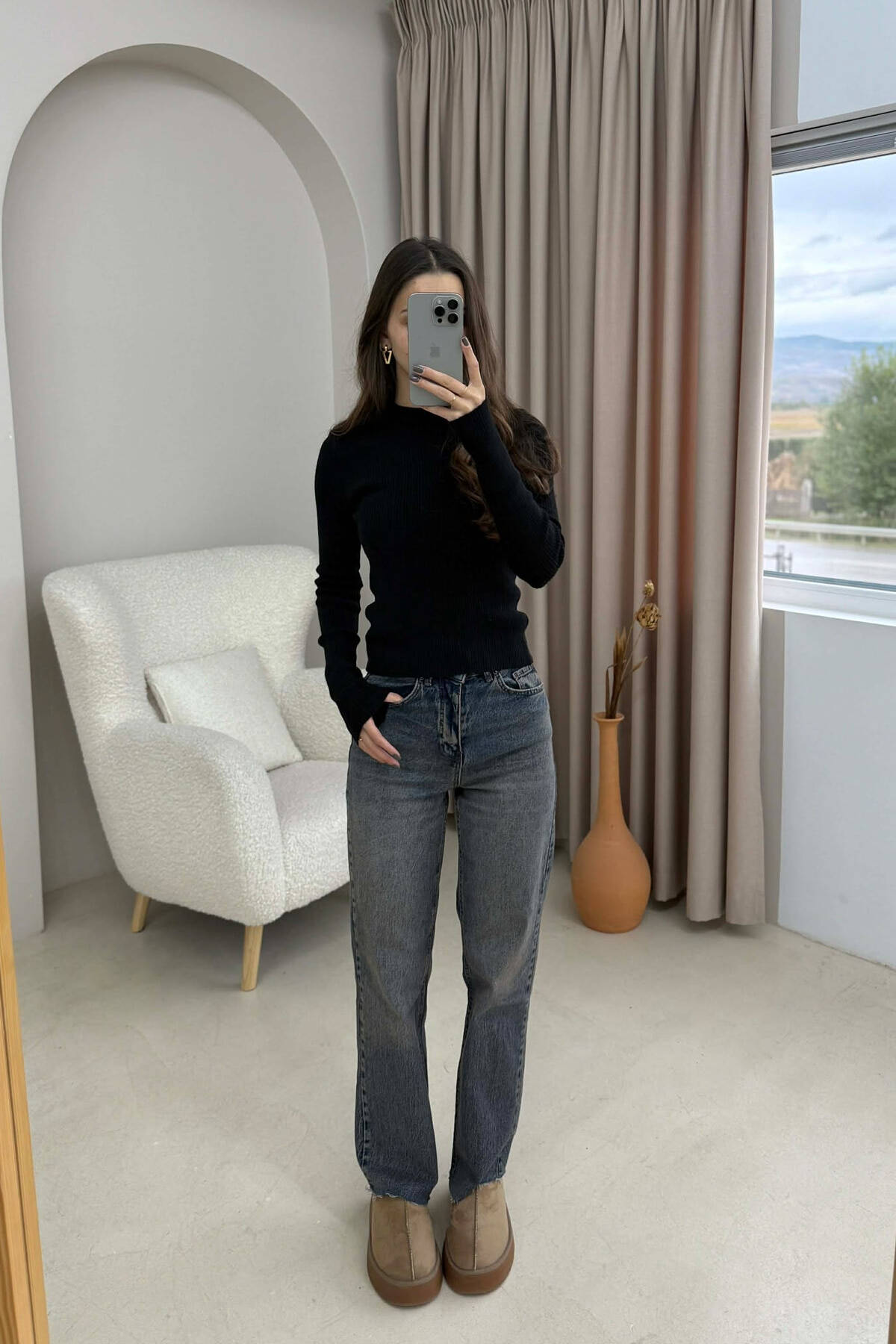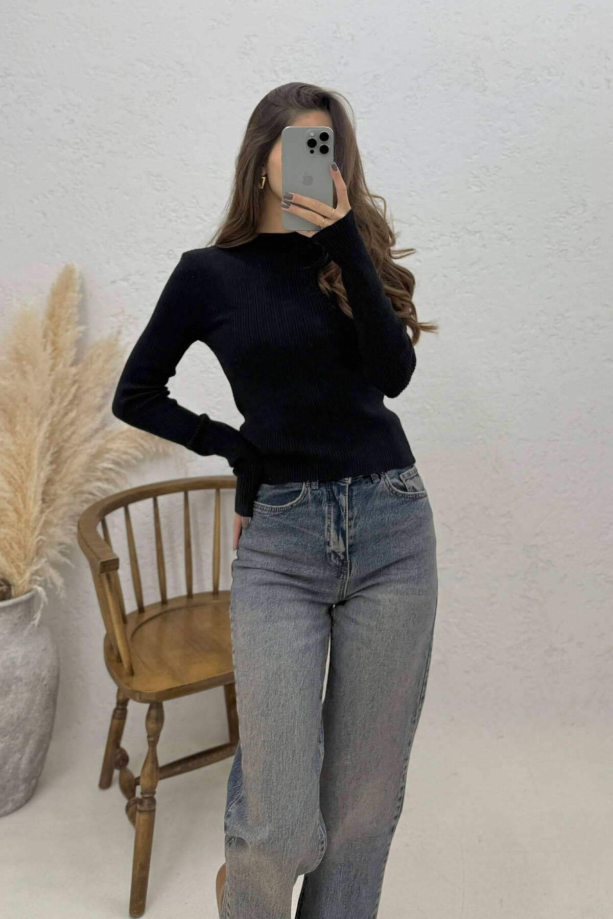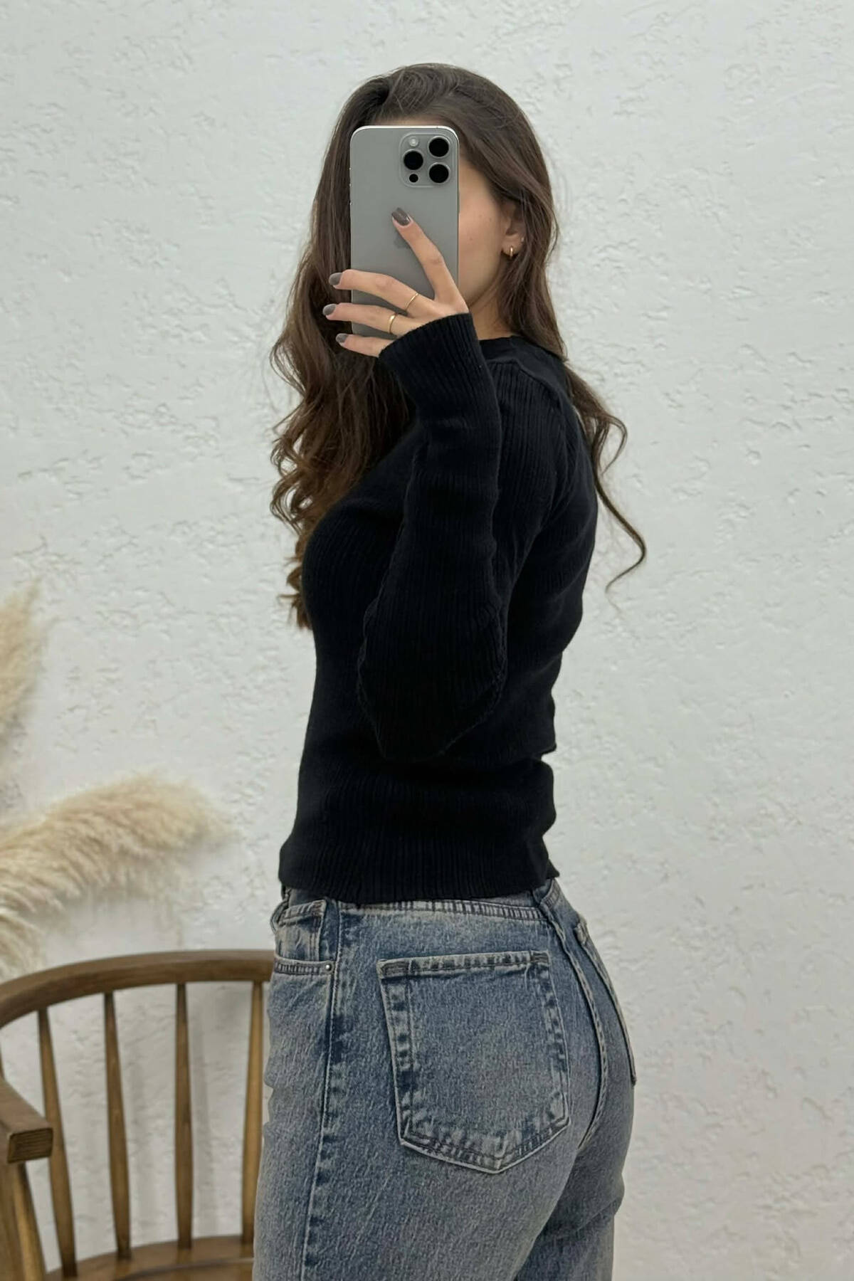 BLUZË NJË NGJYRËSHE ME PUSH DHE JAKË POLO PËR FEMRA NË NGJYRË TË ZEZË