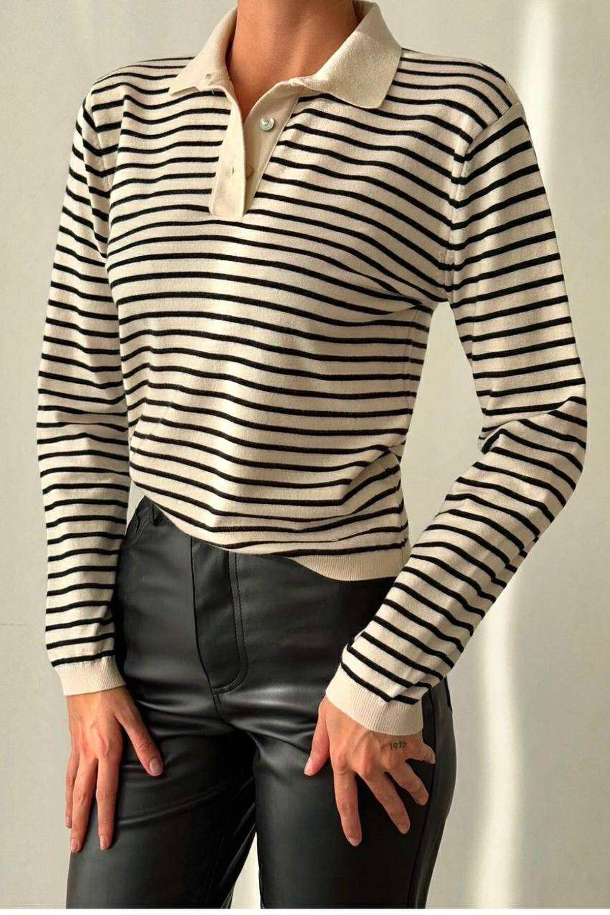 BLUZË ME JAKË POLO DHE VIJA PËR FEMRA NË NGJYRË KREM ME TË ZEZË