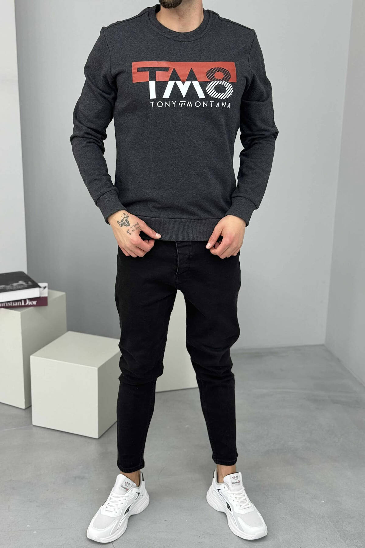 BLUZË ME JAKË RRUMBULLAKE DHE ME DIZAJN NE PJESËN PARA PËR MESHKUJ NË NGJYRËN GRI TË ERRËT
