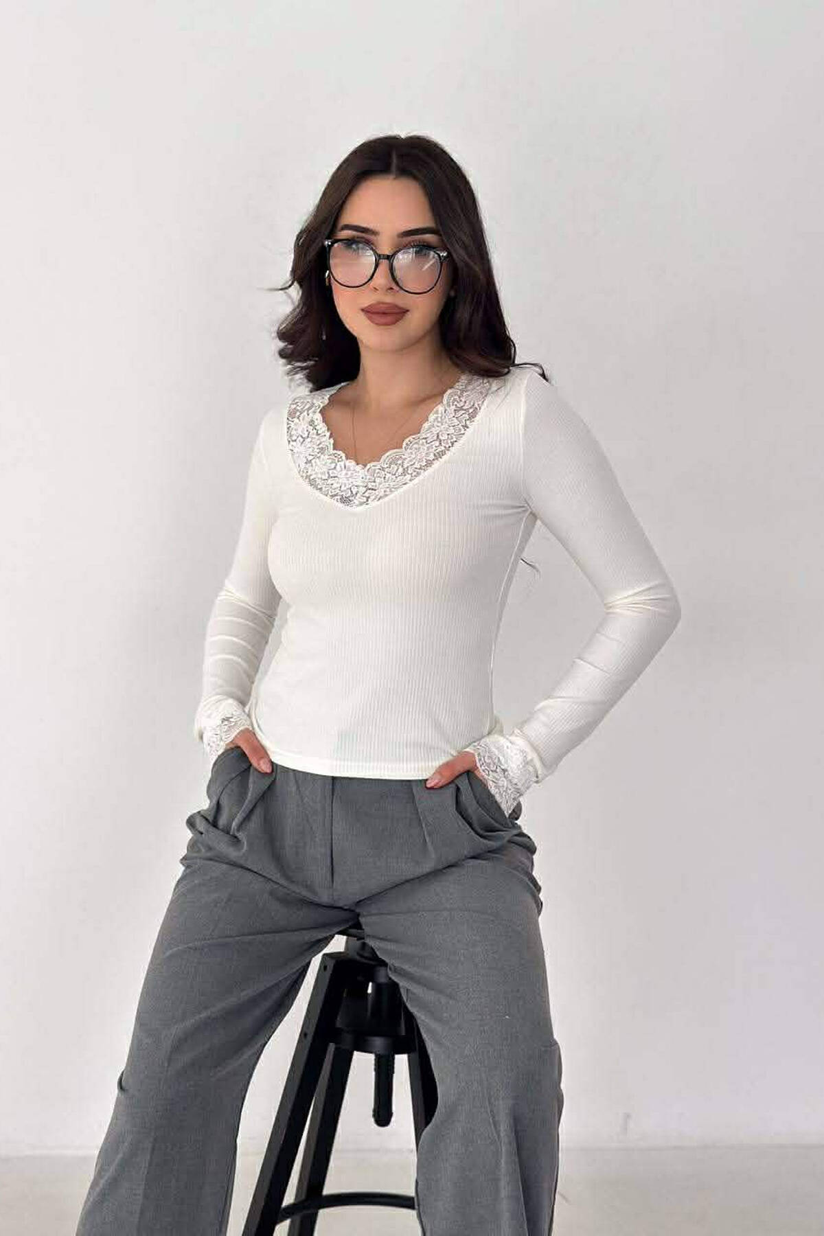 BLUZE ME JAKE V DHE DETAJ DANTELLE PER FEMRA NE NGJYRE TE BARDHE
