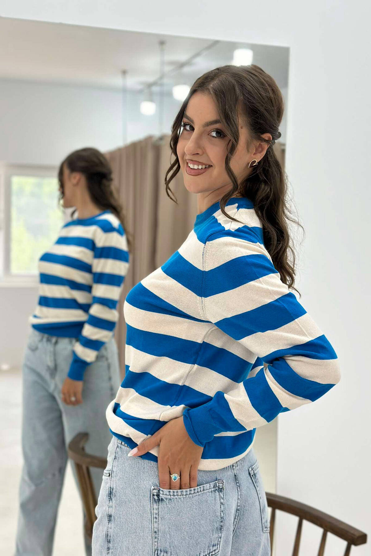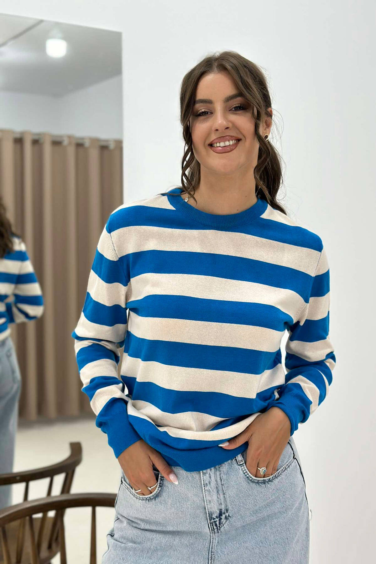 Bejeni tuajen bluzen me vija horizontale , me jake te rrumbullaket , vjen ne nje material fantastik , shume komode dhe perfekte per kombinimet tuaja te perditshme ne shkolle apo pune .