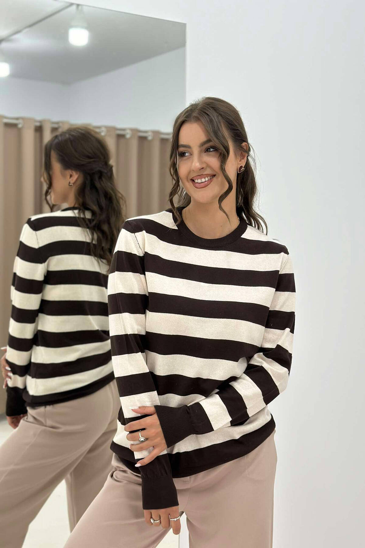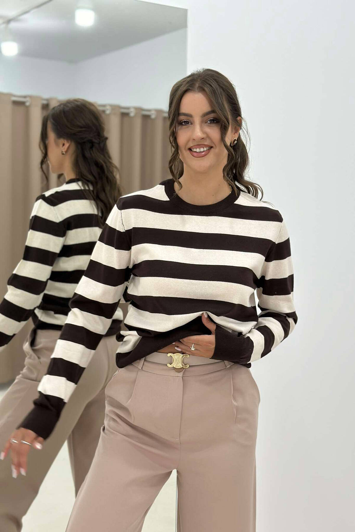Bluzë Me Vija Për Femra Në Ngjyrë Kafe E Errët