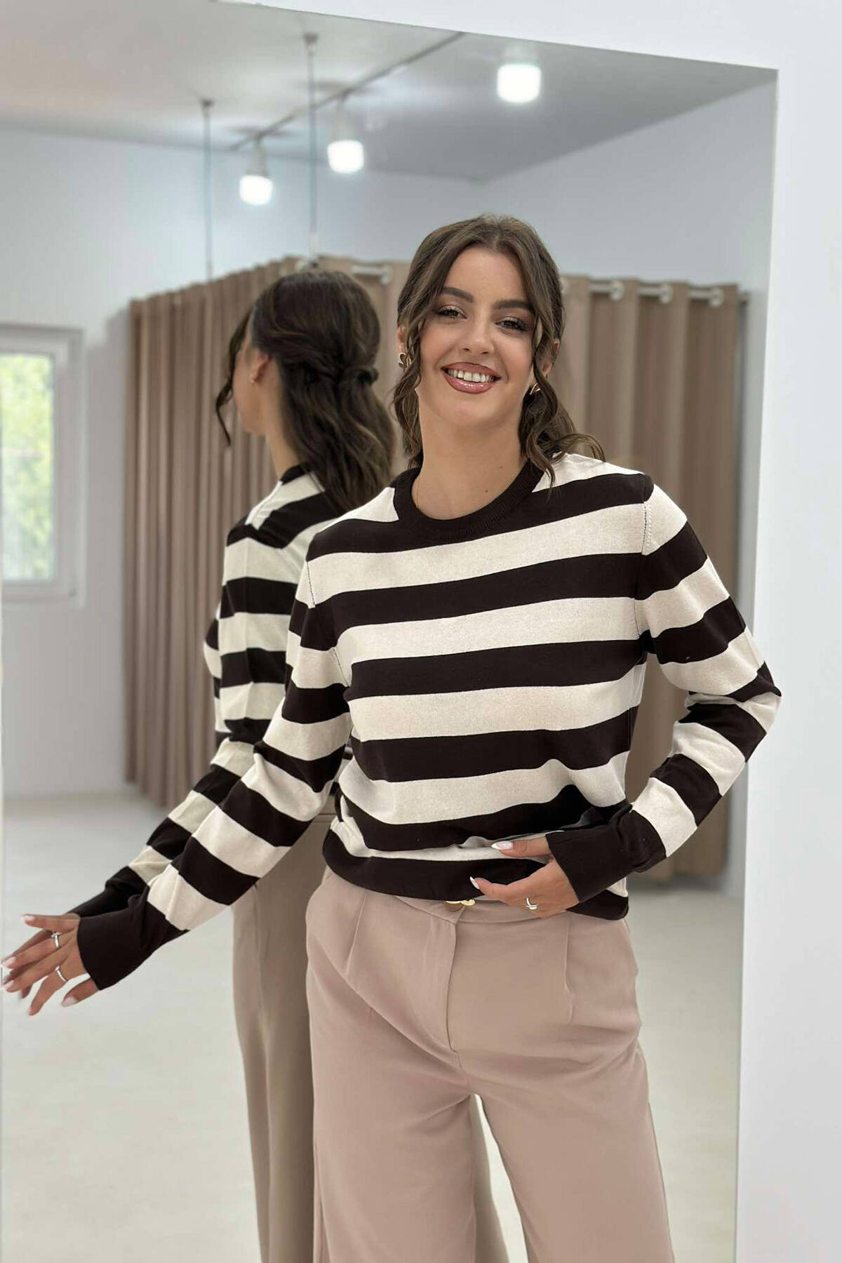 Bejeni tuajen bluzen me vija horizontale , me jake te rrumbullaket , vjen ne nje material fantastik , shume komode dhe perfekte per kombinimet tuaja te perditshme ne shkolle apo pune .