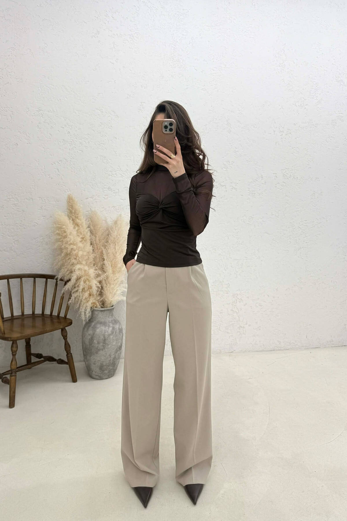 BLUZE NJE NGJYRESHE ME DETAJ TYLI PER FEMRA NE NGJYRE KAFE