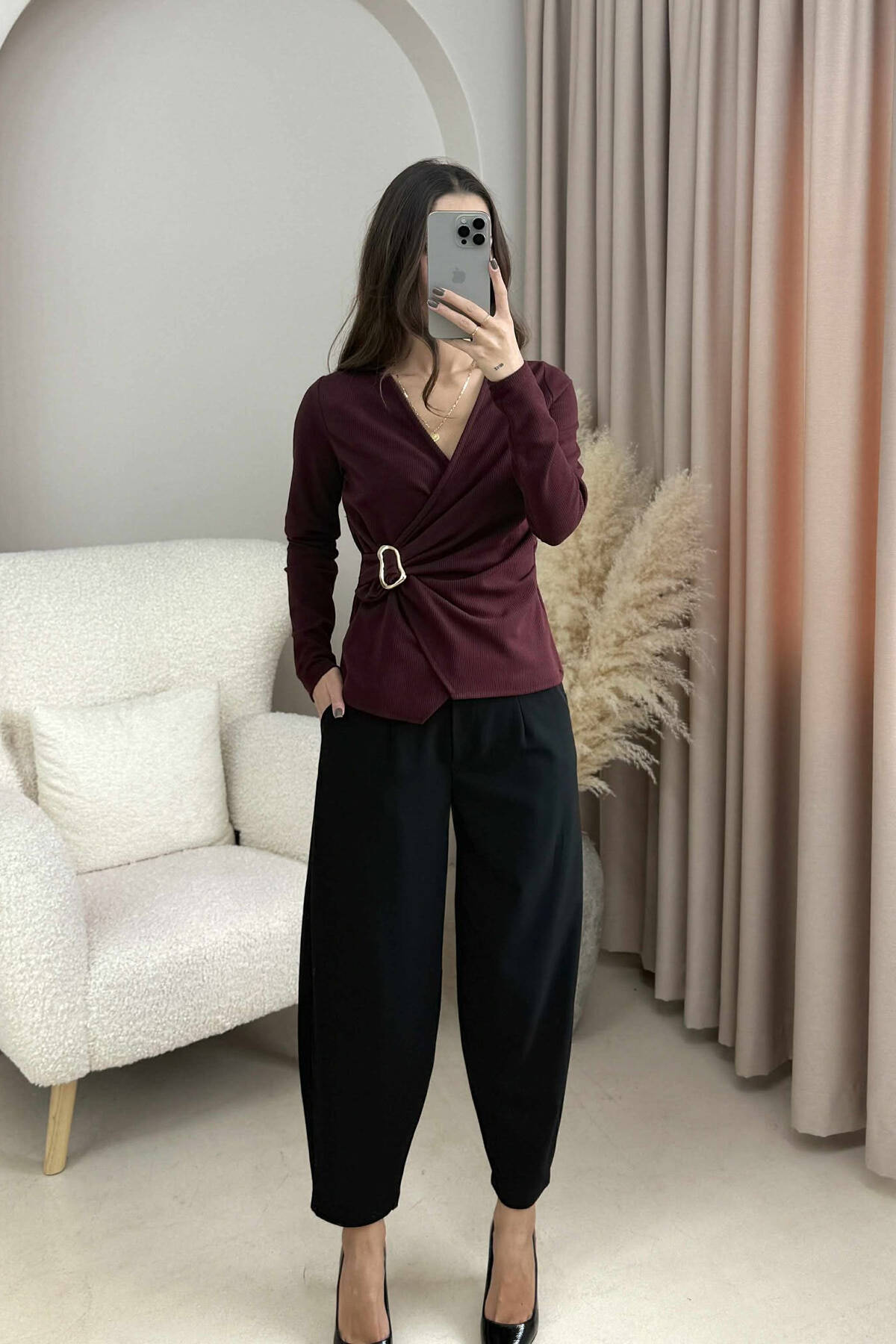 BLUZË NJË NGJYRËSHE ME DETAJE PËR FEMRA NË NGJYRË VISHNJË TË ERRËT