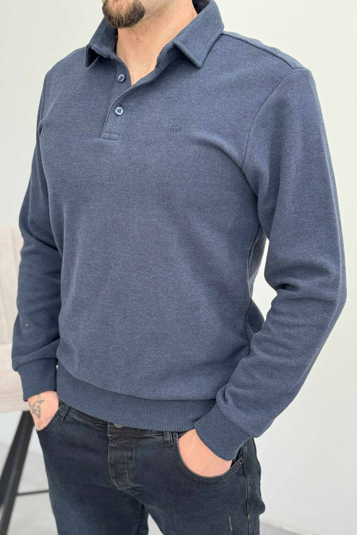 BLUZË NJË NGJYRËSHE ME JAKË POLO DHE BUTONA PËR MESHKUJ NË NGJYRËN BLU LEJLA