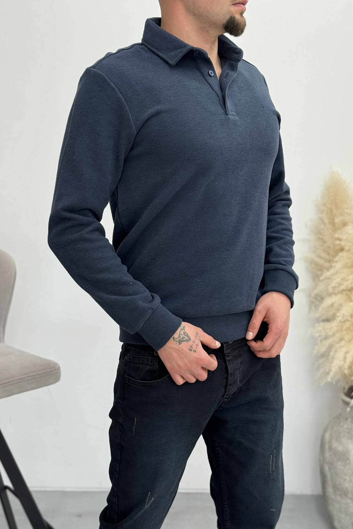 BLUZË E THJESHTË NJË NGJYRËSHE ME JAKE V PËR MESHKUJ NË NGJYRËN BLU TË ERRËT