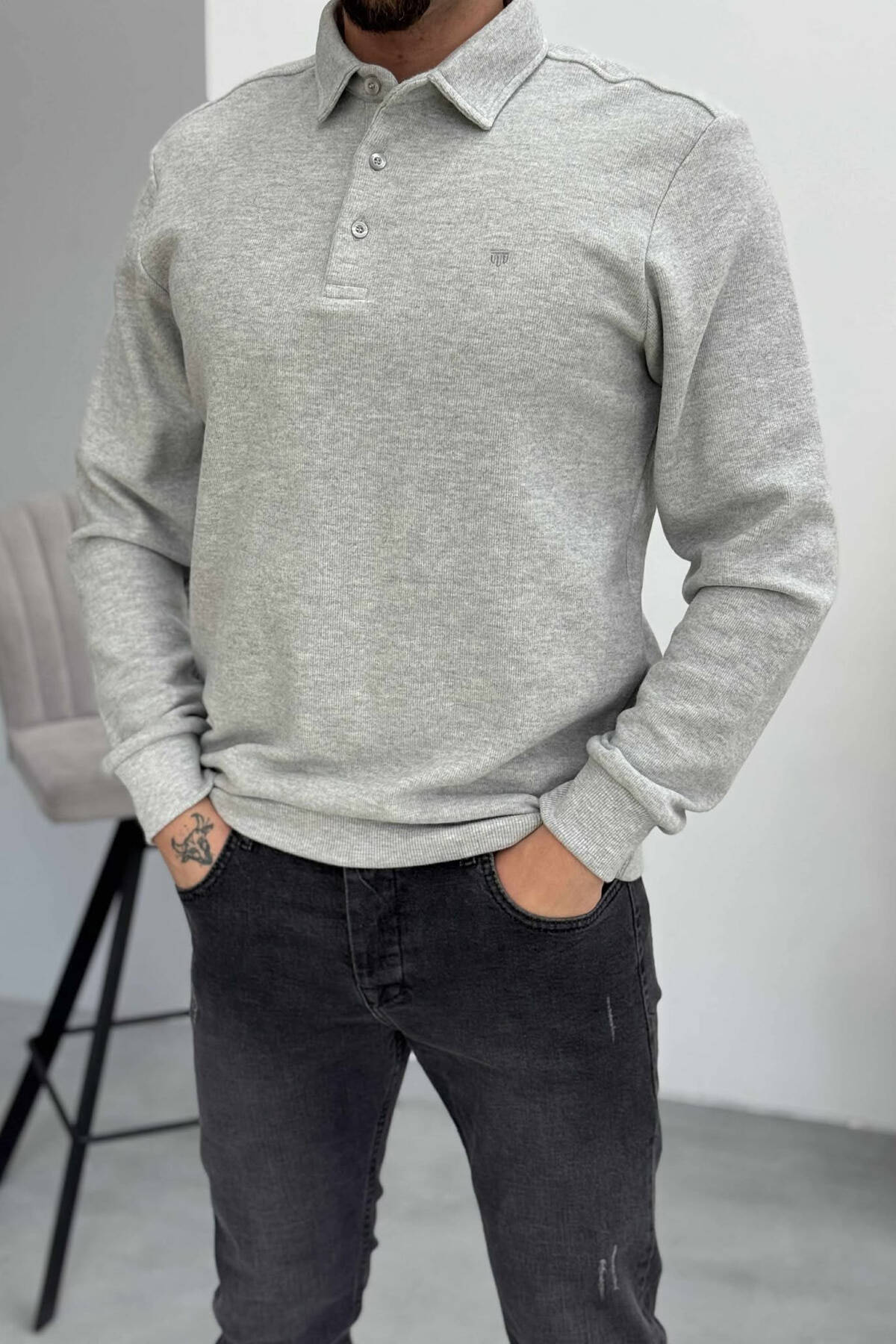 BLUZË NJË NGJYRËSHE ME JAKË POLO DHE BUTONA PËR MESHKUJ NË NGJYRËN GRI TË ZBARDHUR
