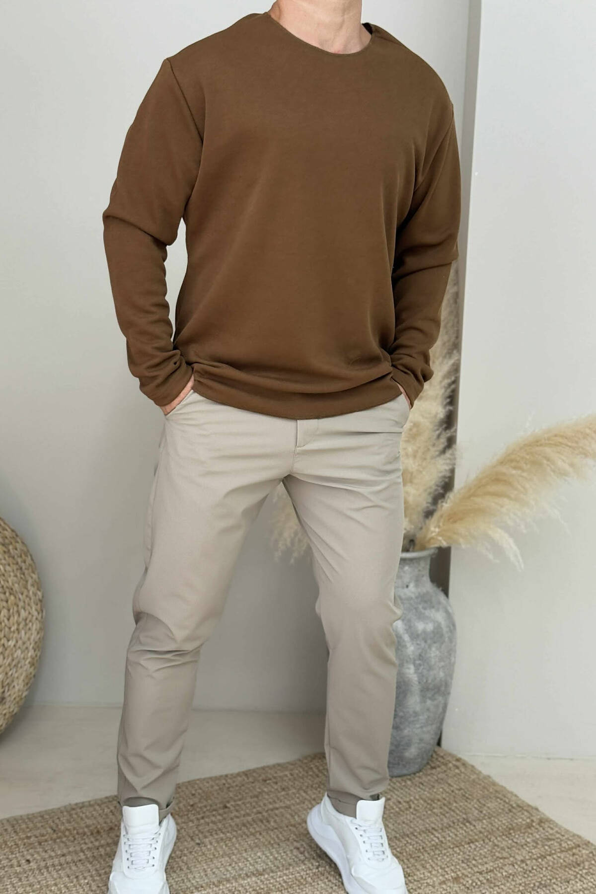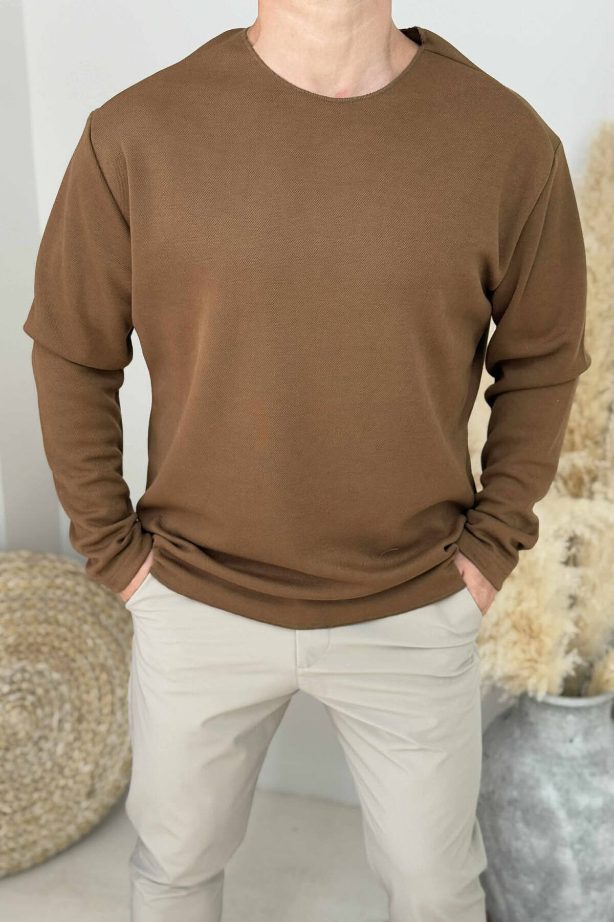 BLUZË NJËNGJYRËSHE ME JAKË TË RRUMBULLAKËT PËR MESHKUJ NË NGJYRËN KAFE