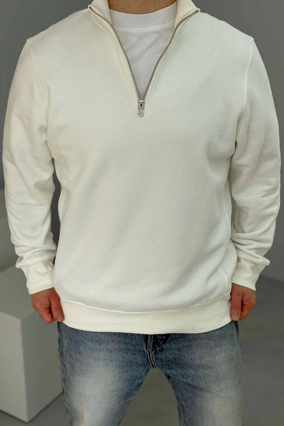BLUZË NJËNGJYRËSHE ME PUSH DHE ME JAKË ME ZINXHIR PËR MESHKUJ NË NGJYRËN E BARDHË