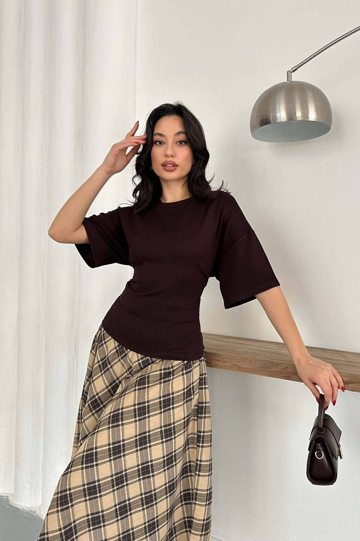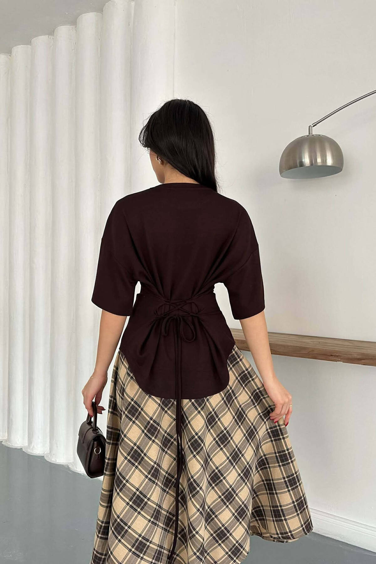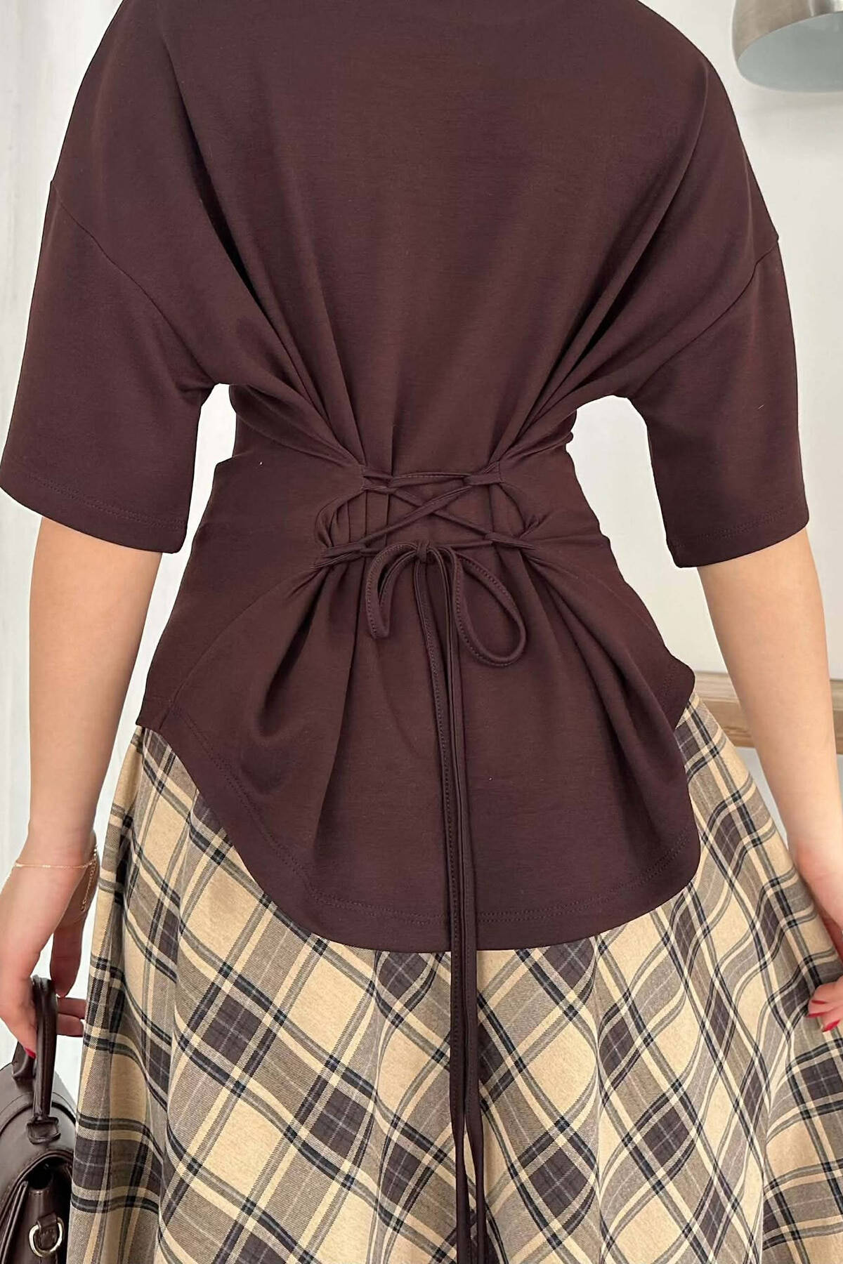 BLUZE NJE NGJYRESHE ME DETAJIN E LIDHSEVE PER FEMRA NE NGJYRE KAFE