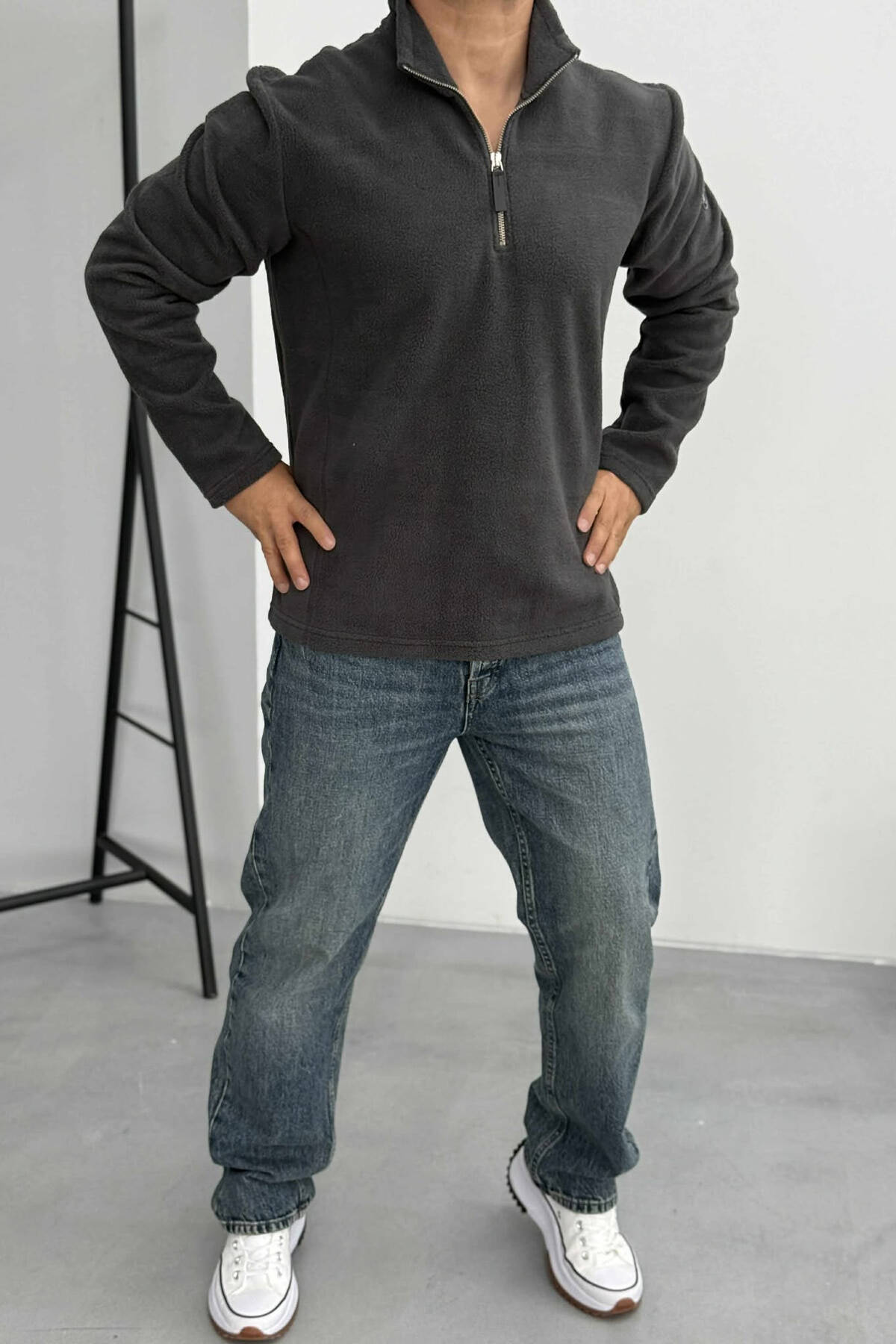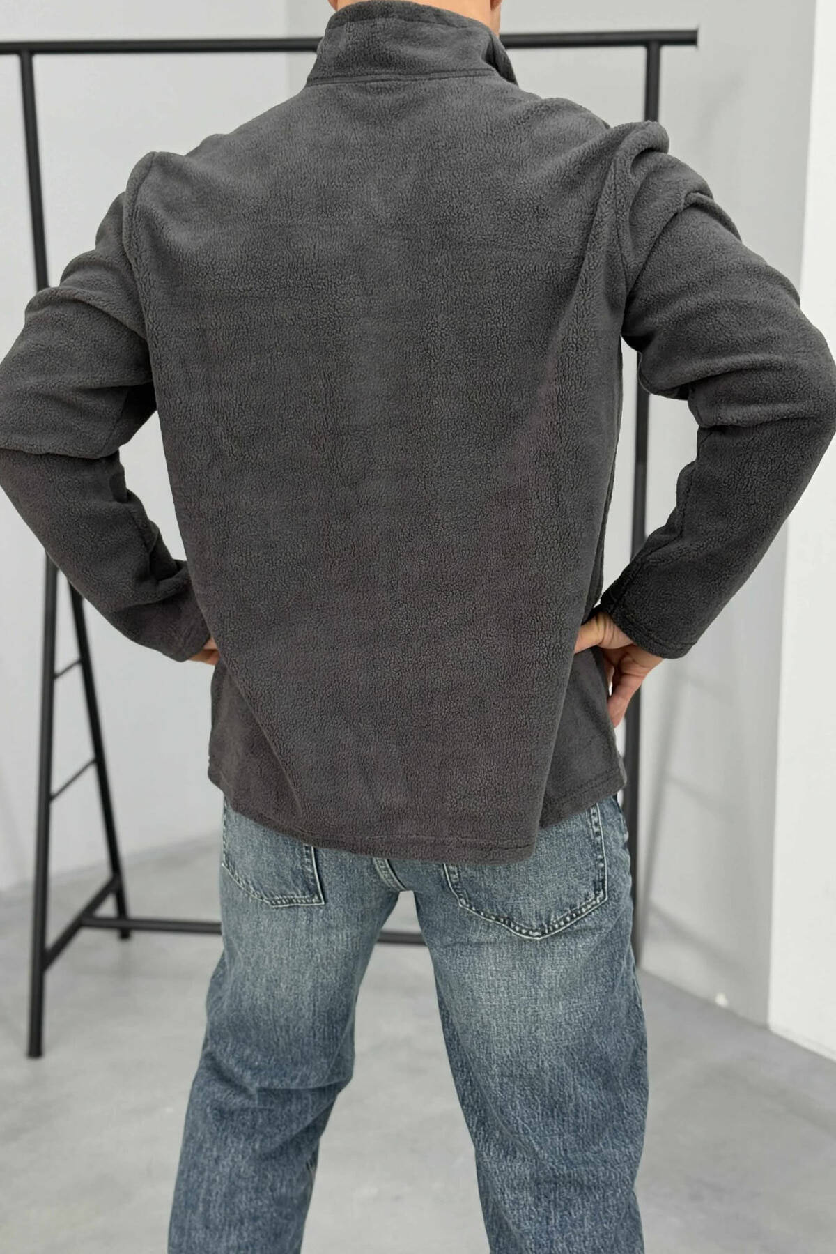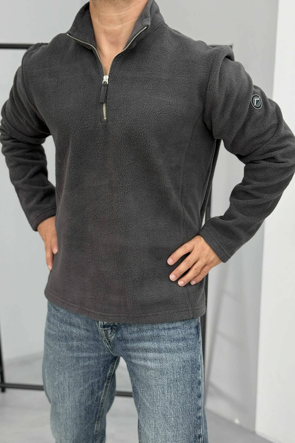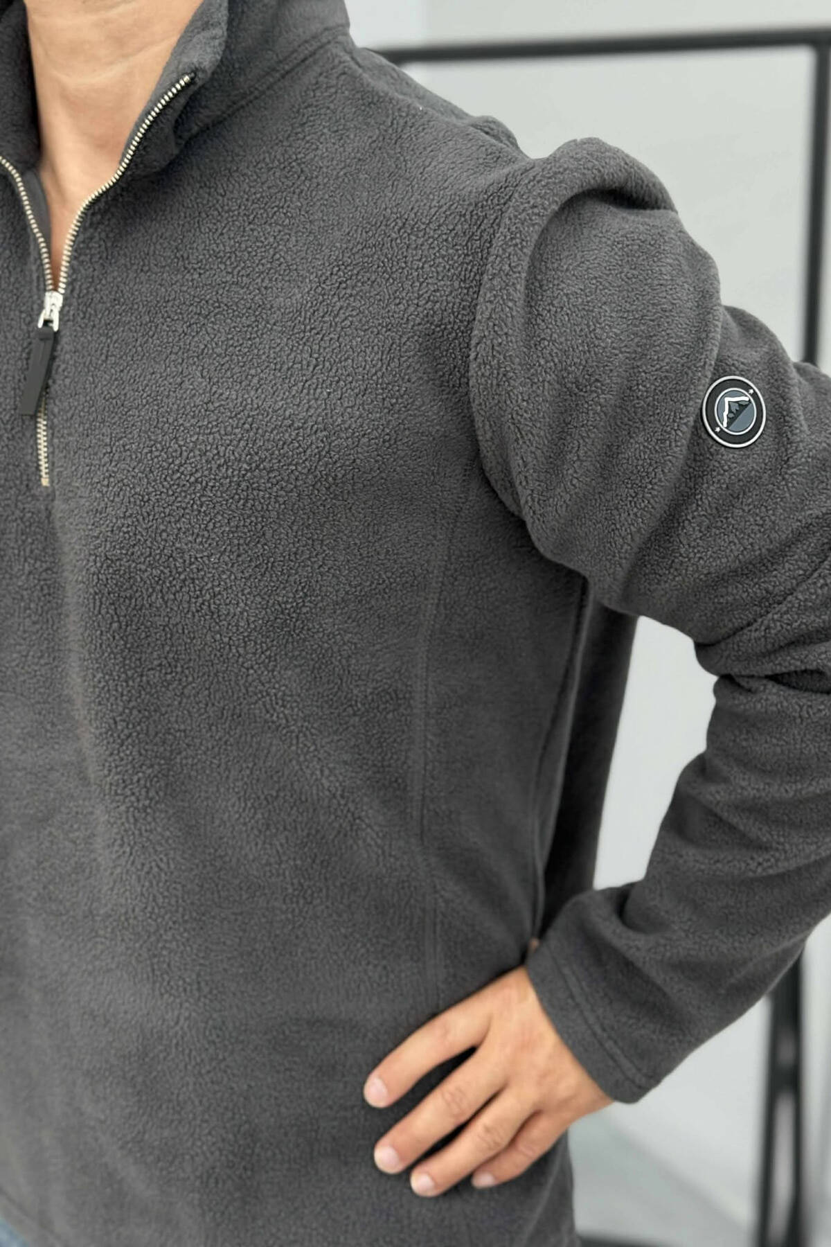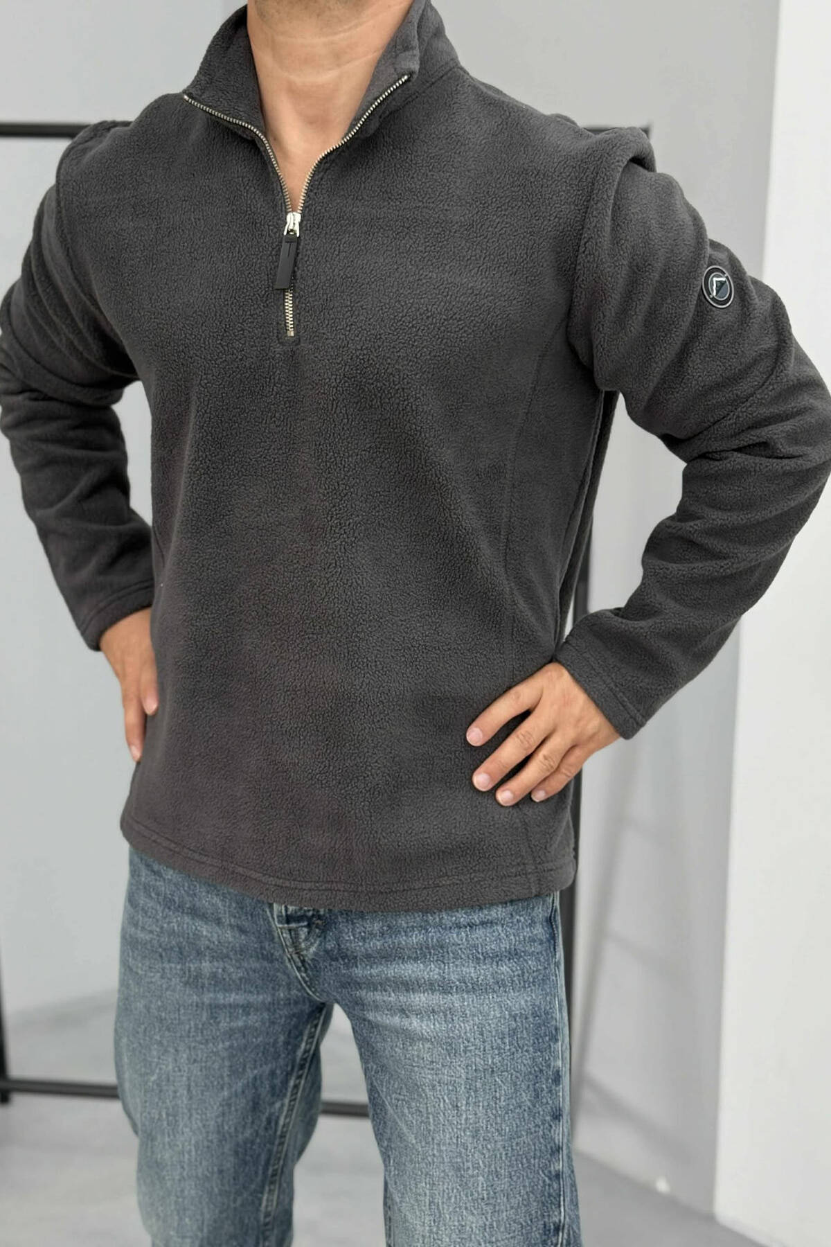 BLUZË POLARE NJË NGJYRËSHE ME JAKË ME ZINXHIR PËR MESHKUJ NË NGJYRËN GRI TË ERRËT