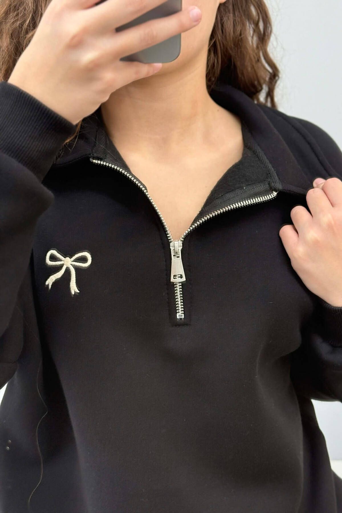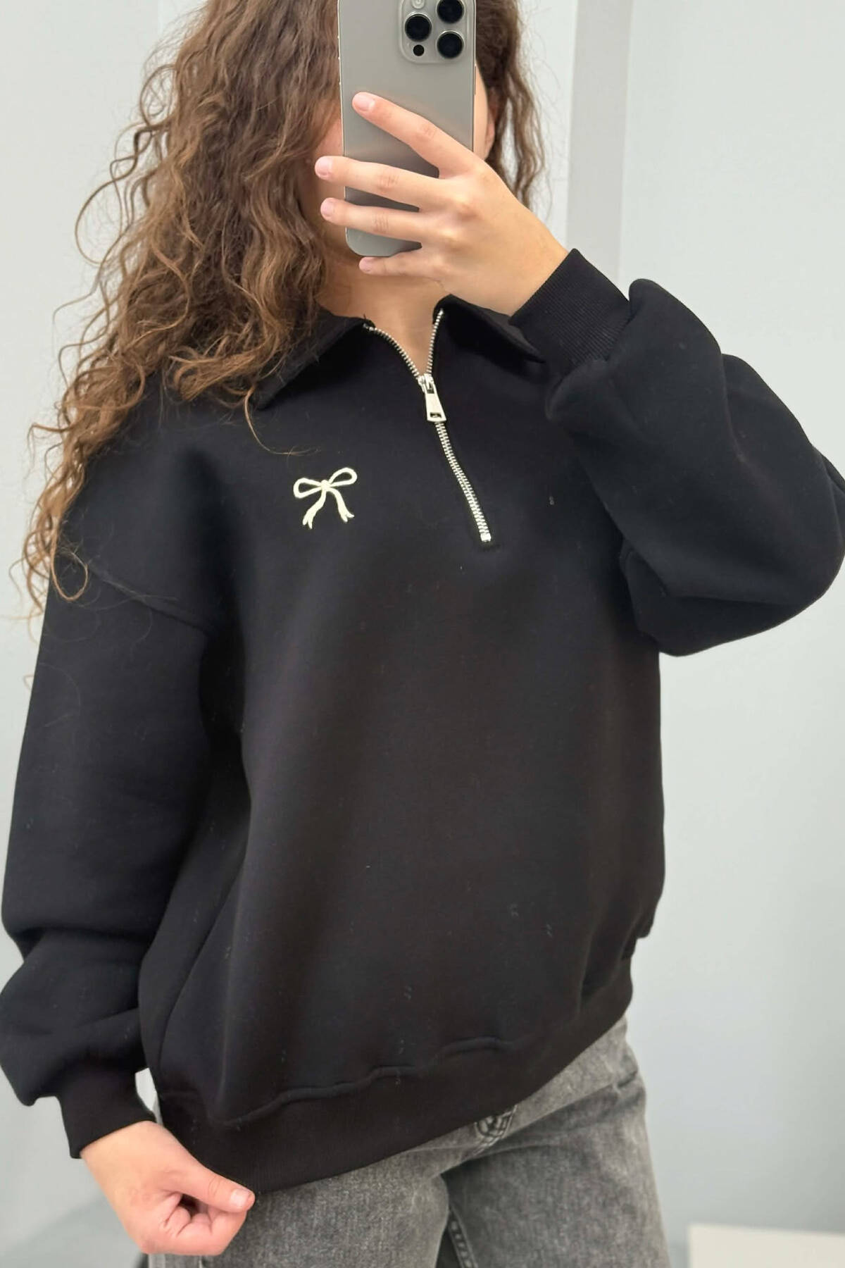BOW DETAIL POLO NECK ZIPPER FLUFFY WOMEN SWEATSHIRT BLACK/ E ZEZE