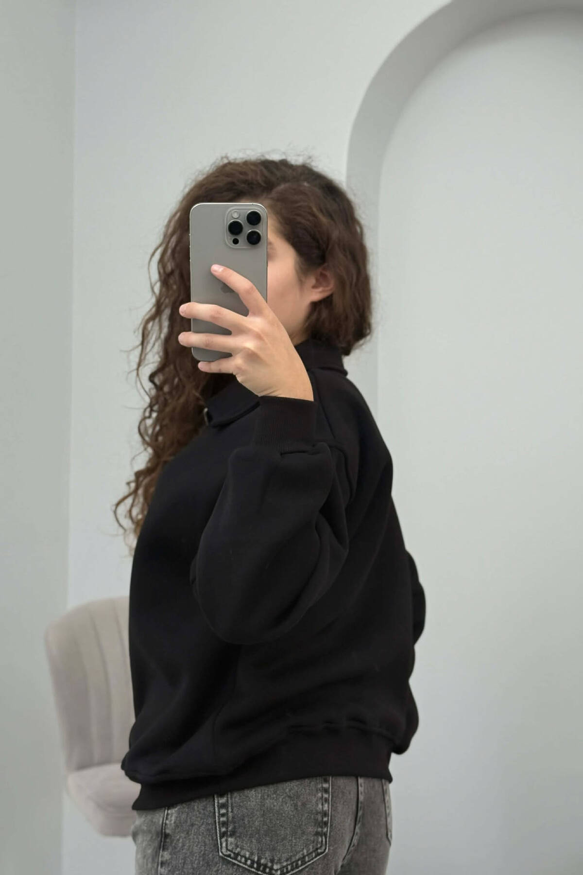 ONE COLOR FLUFFY POLO NECK WOMEN SWEATSHIRT BLACK/ E ZEZE