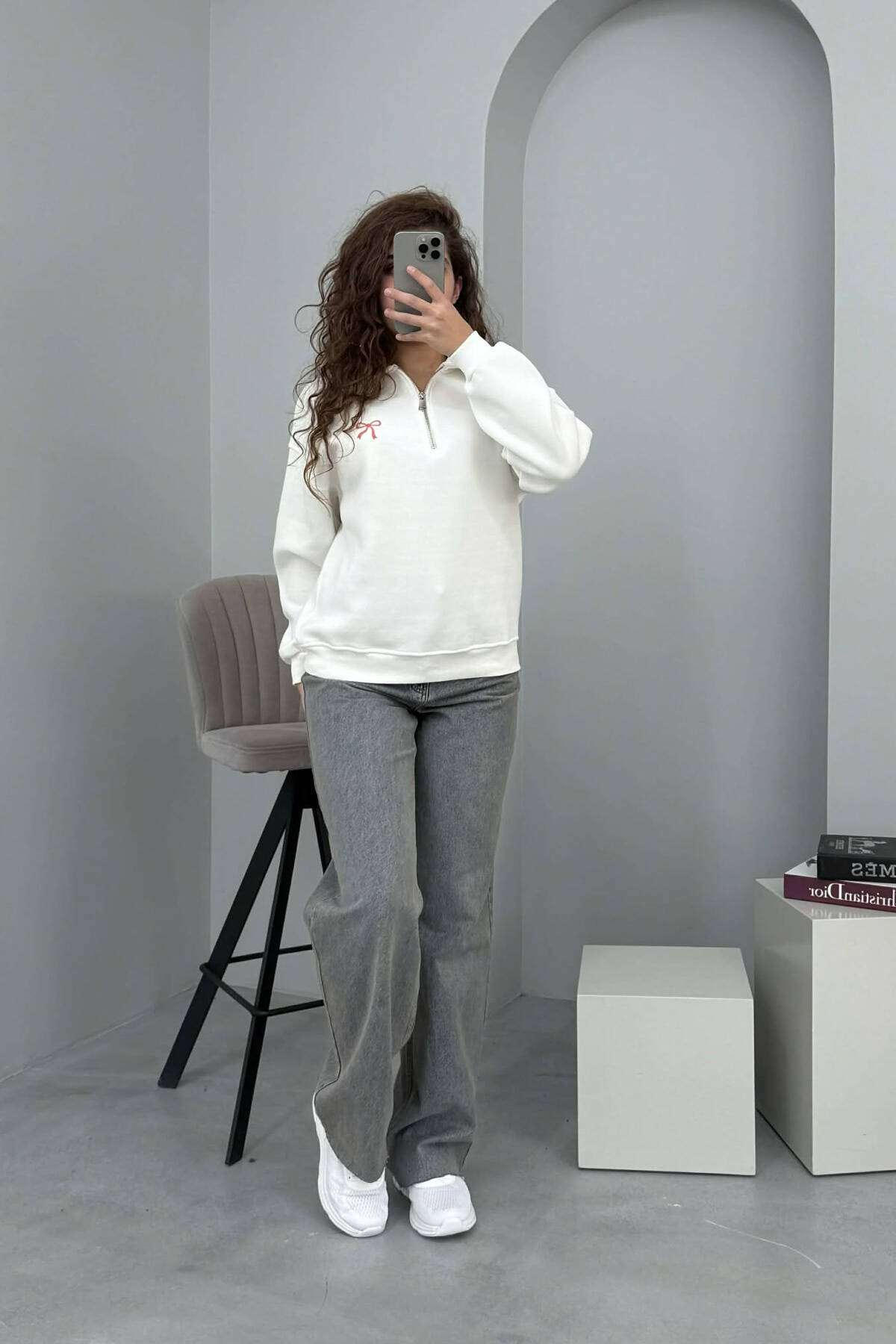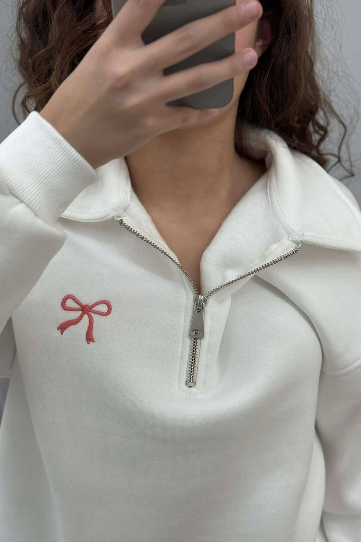 BOW DETAIL POLO NECK ZIPPER FLUFFY WOMEN SWEATSHIRT WHITE-E BARDHE