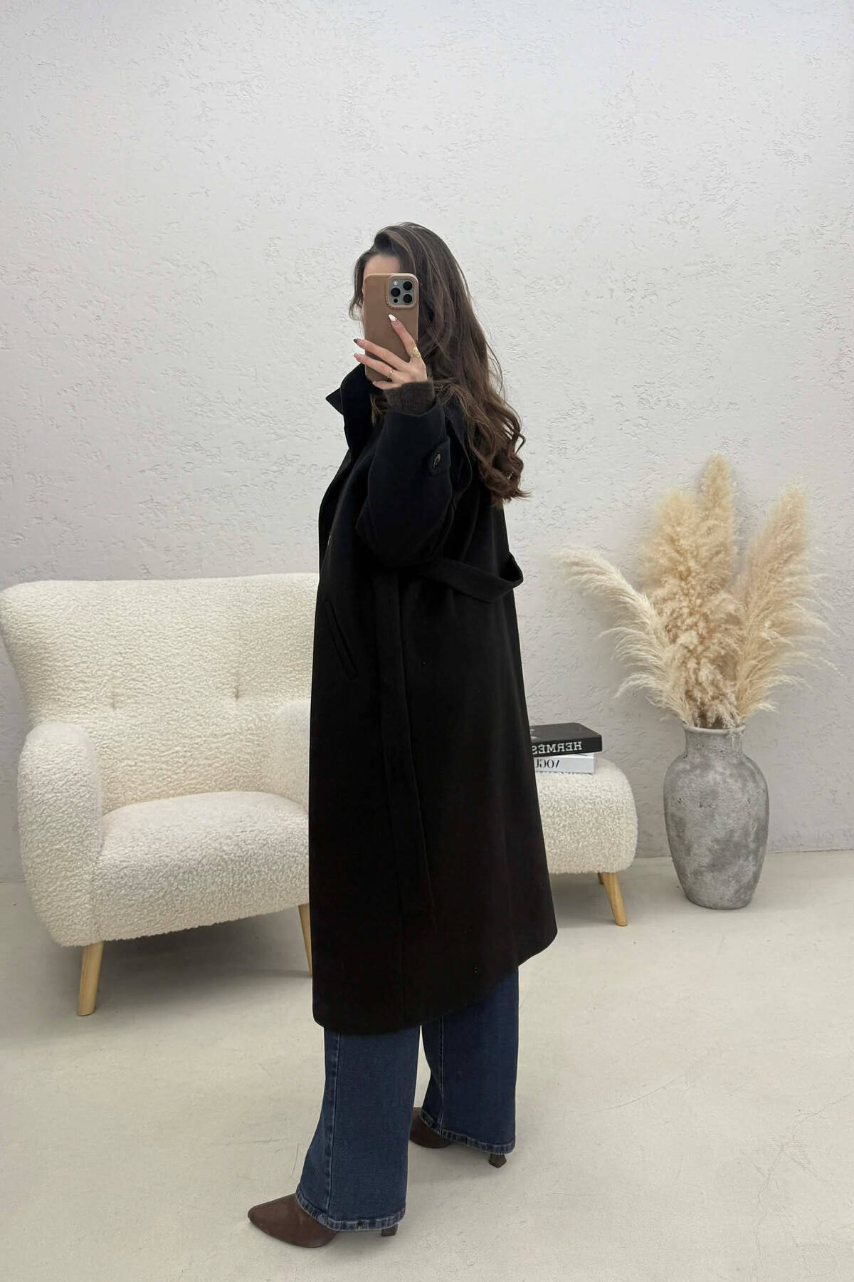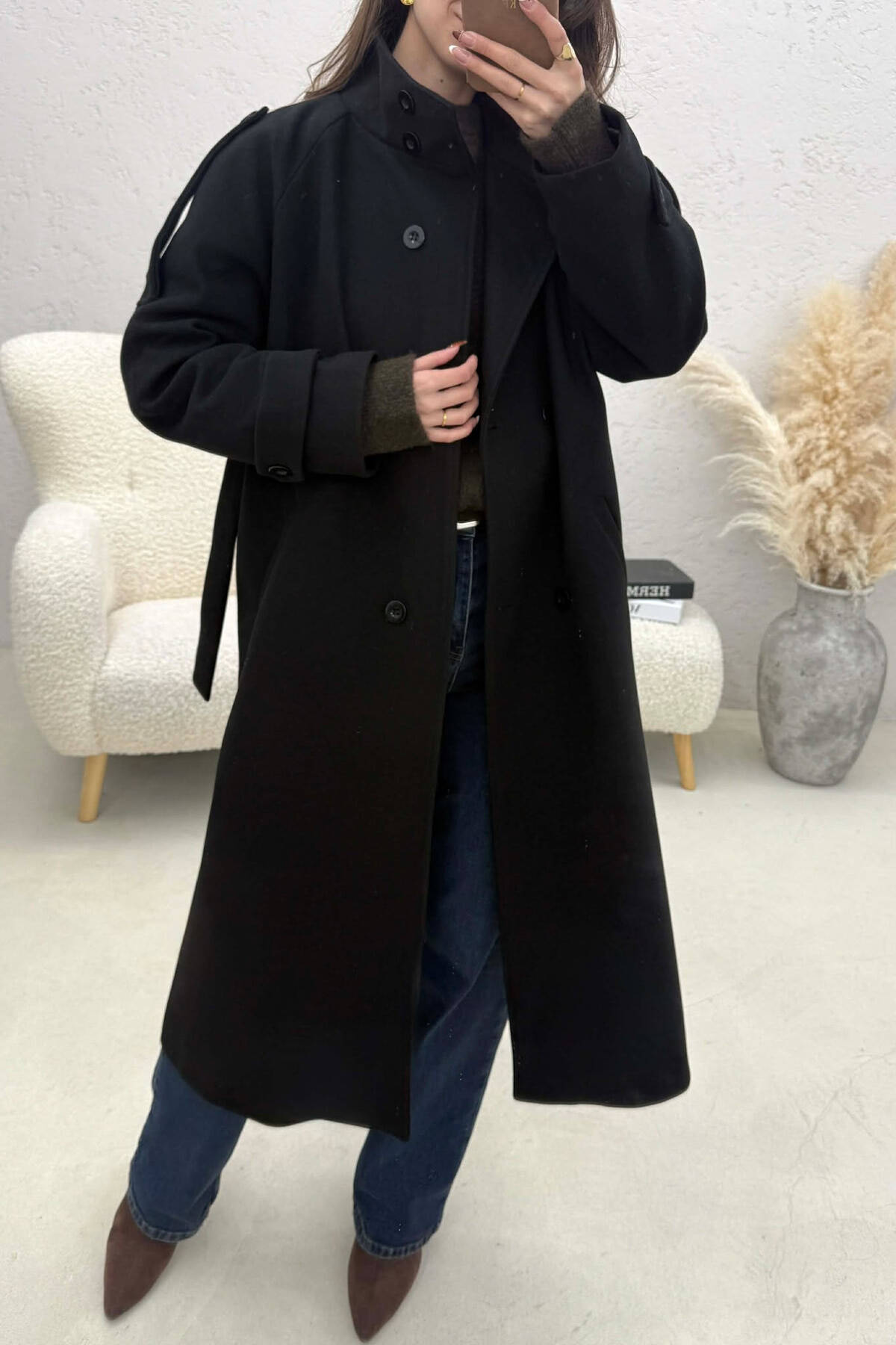 ONE COLOR LEATHER BUTTONED BELT DETAIL LONG WOMAN COAT BROWN/KAFE