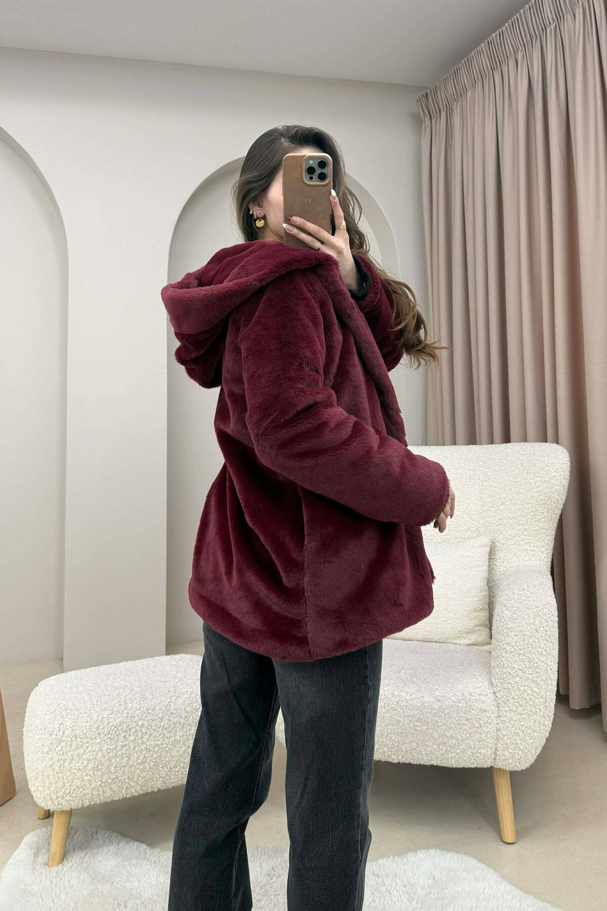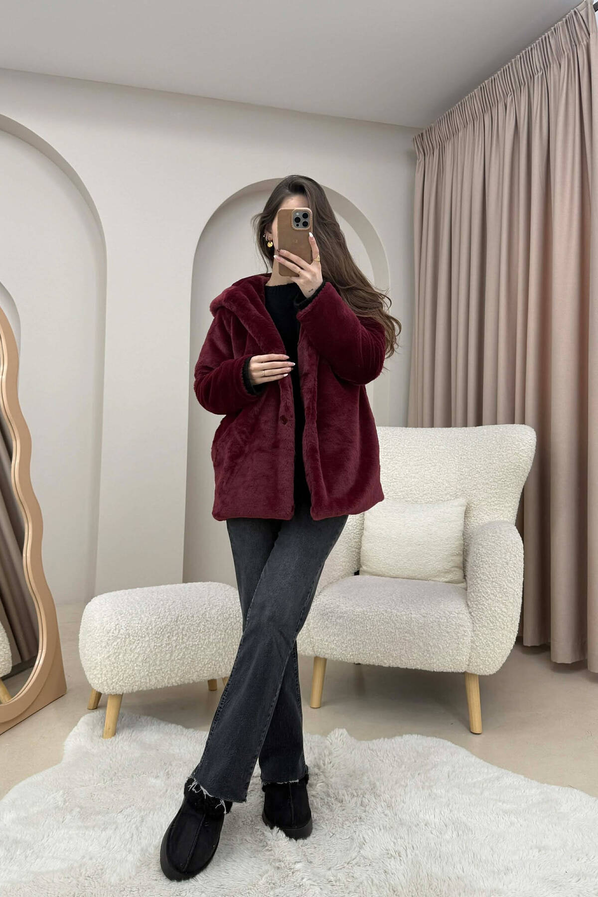 PALLTO PELLUSHI ME KAPUÇ DHE BUTONA PER FEMRA NE NGJYRE VISHNJE