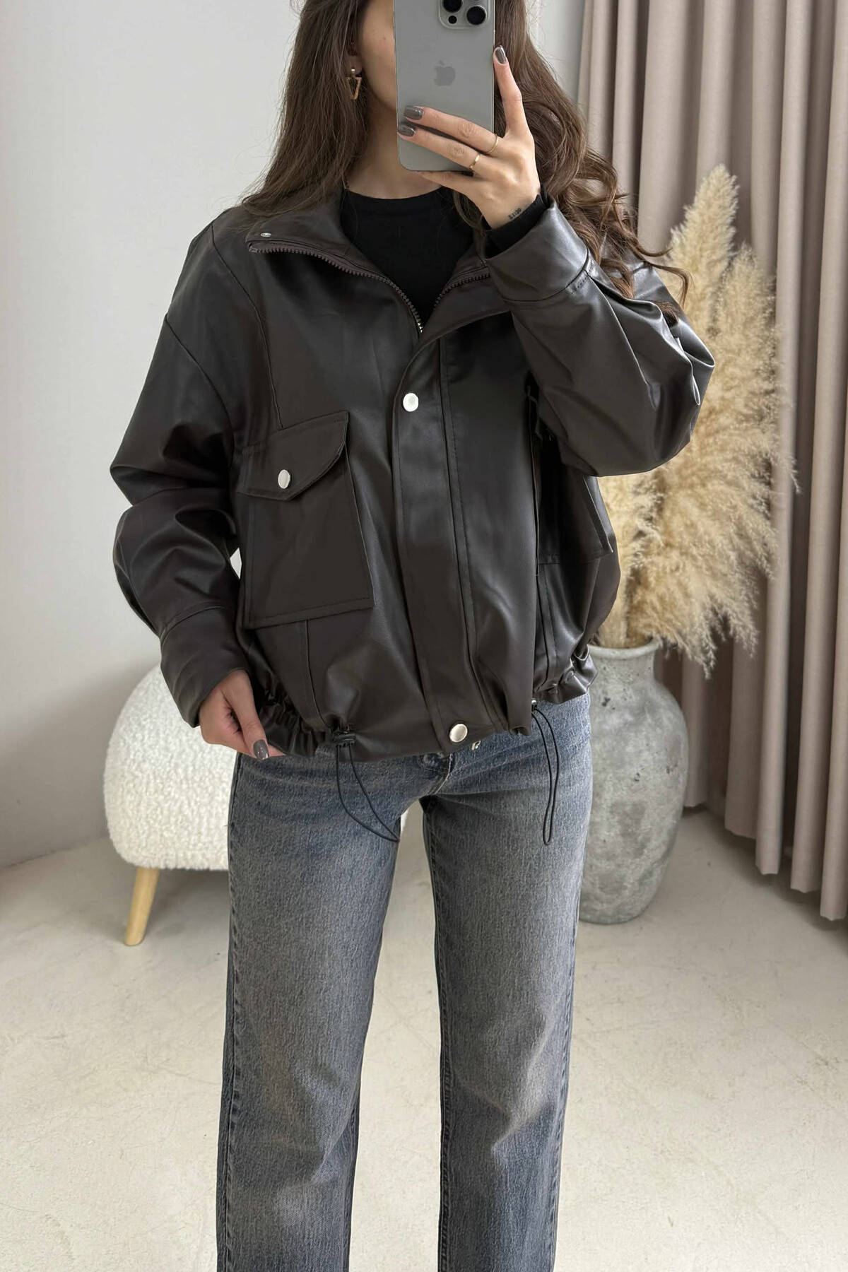 BUTTONED LEATHER WOMEN JACKET BROWN/KAFE