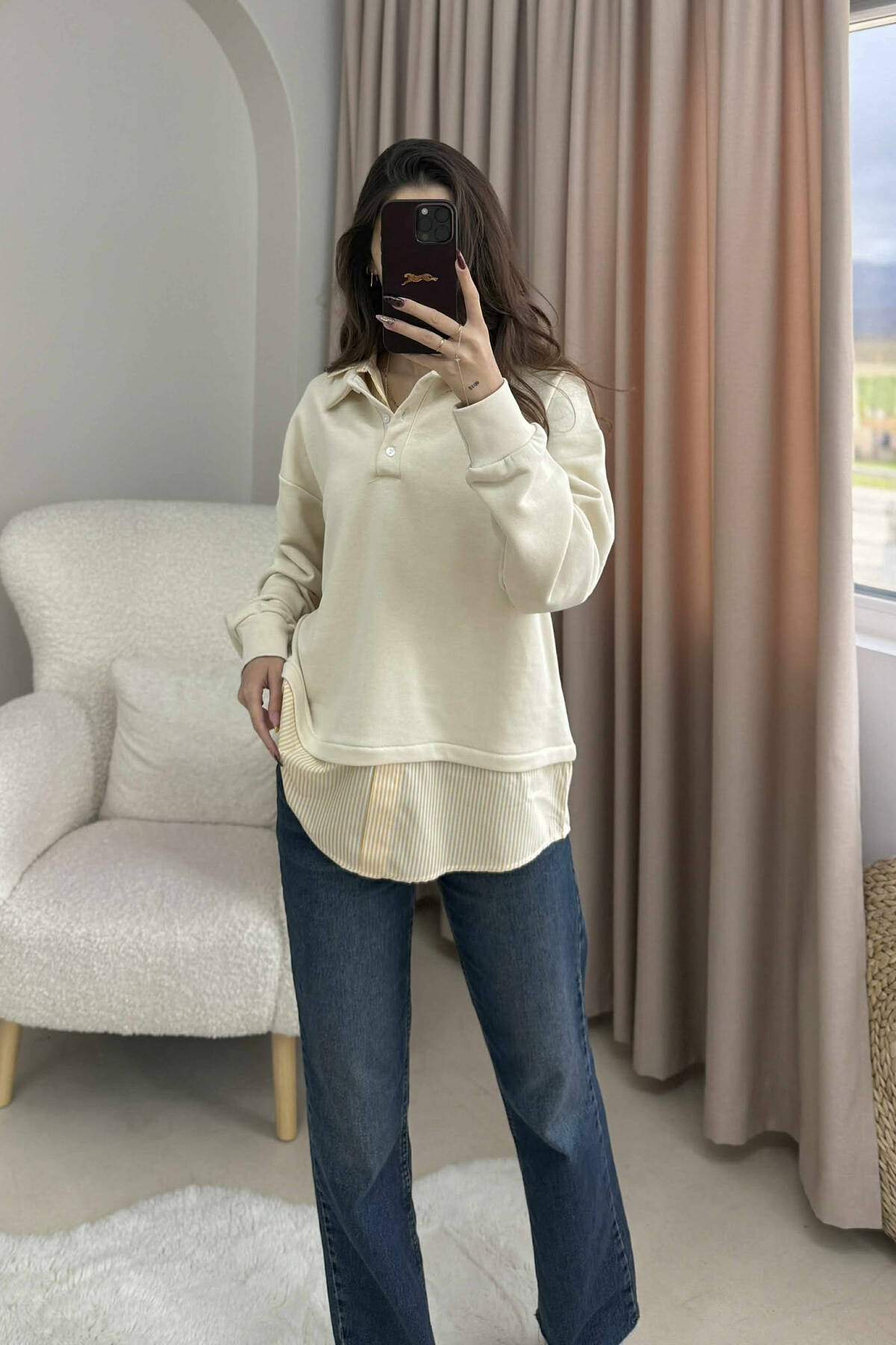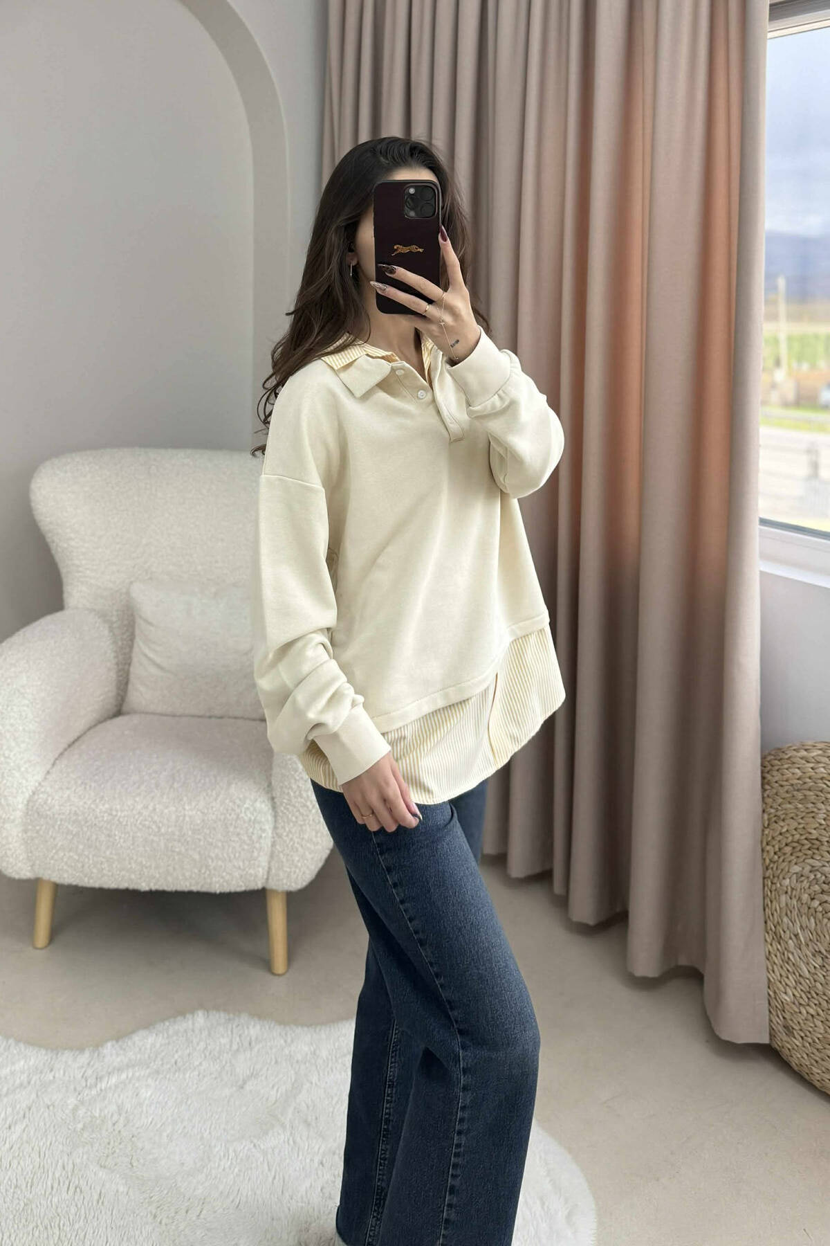 BUTTONED POLO NECK SIMPLE WOMEN SWEATSHIRT BEIGE/BEZHE