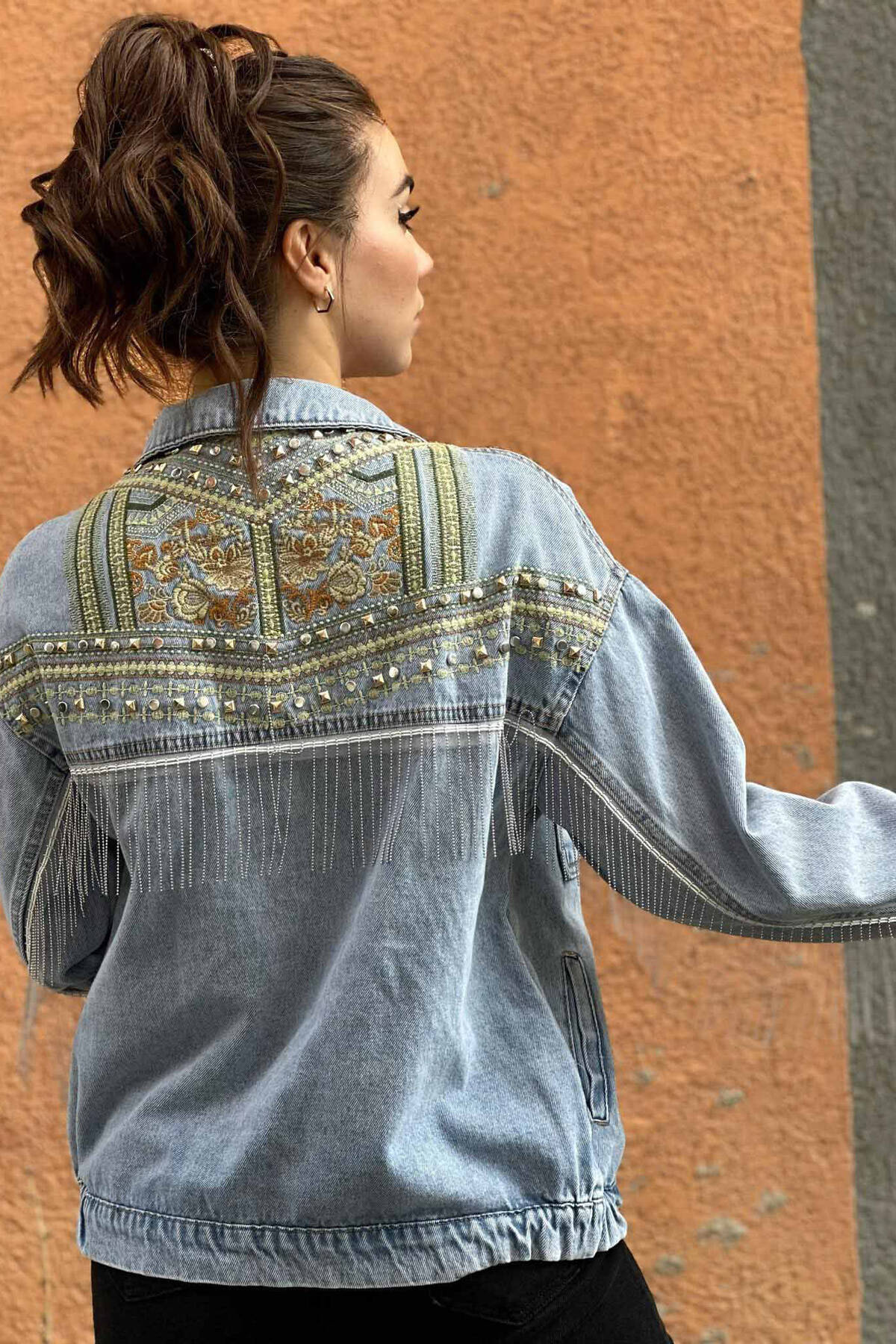 XHAKETË XHINS PËR FEMRA ME NJË PJESË PELLUSHI NË NGJYRË TË ZEZË