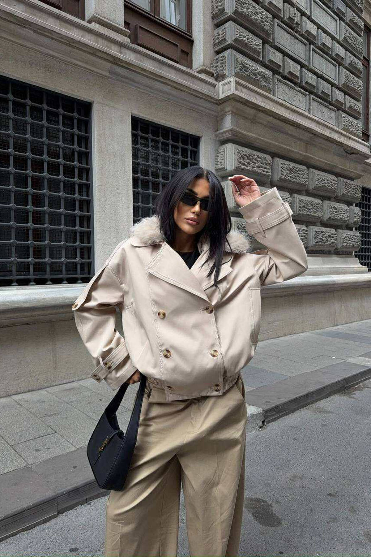 BUTTONS DETAIL FLUFFY NECK SHORT WOMEN JACKET BEIGE/BEZHE