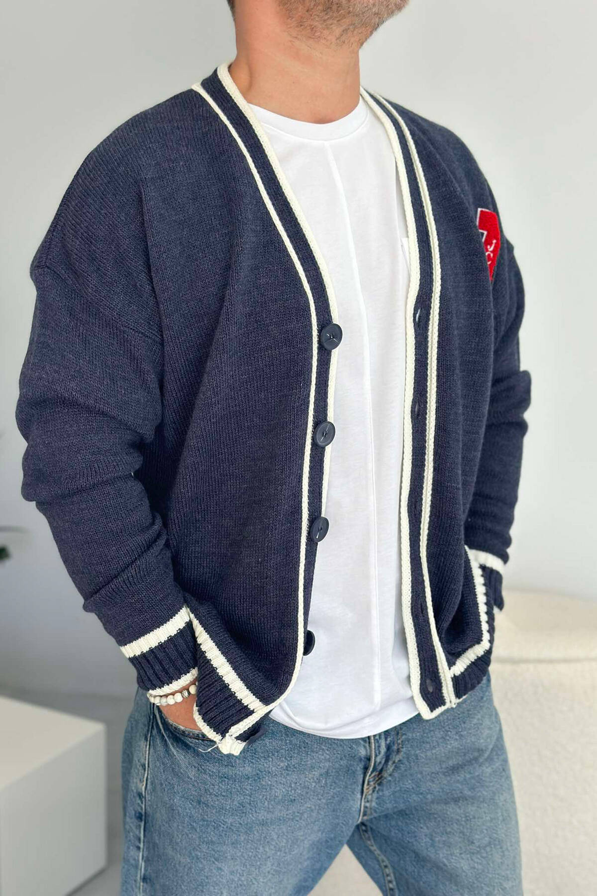 Men's pullover with button fastening, comes with designs of stripes and a letter on the side. Easy to combine and with a super quality material, it will also keep you warm on cold days.