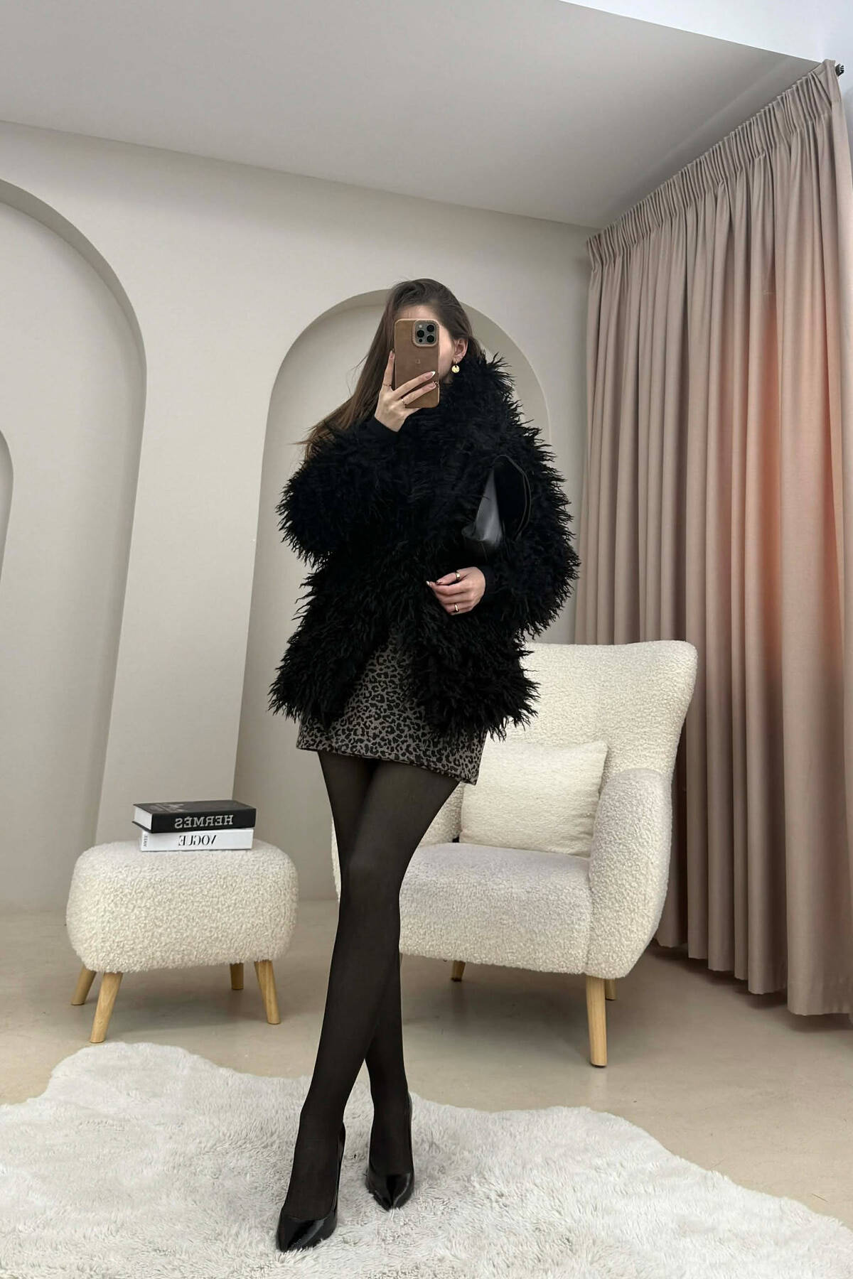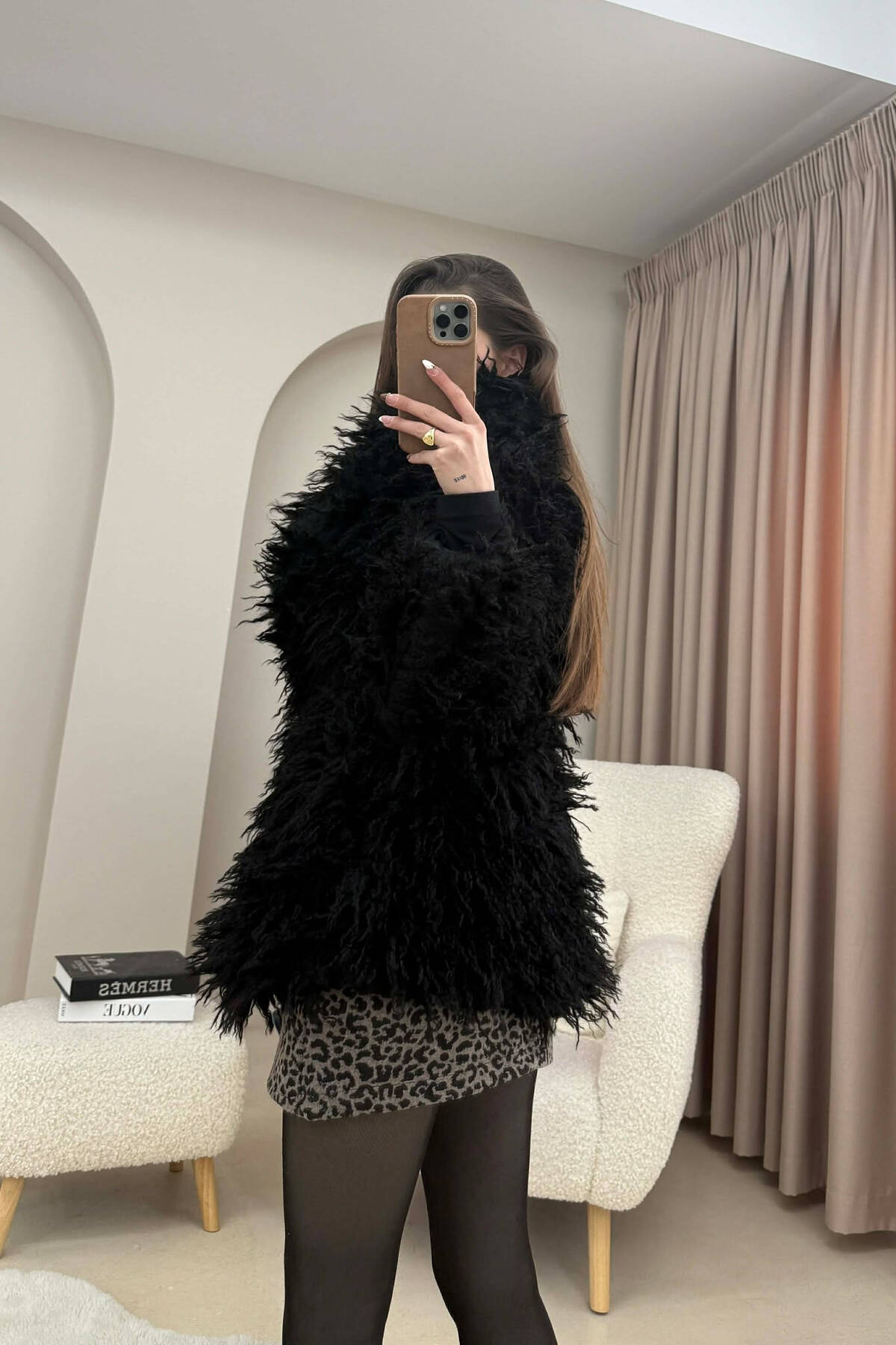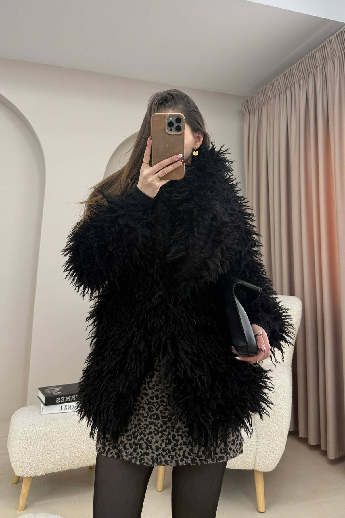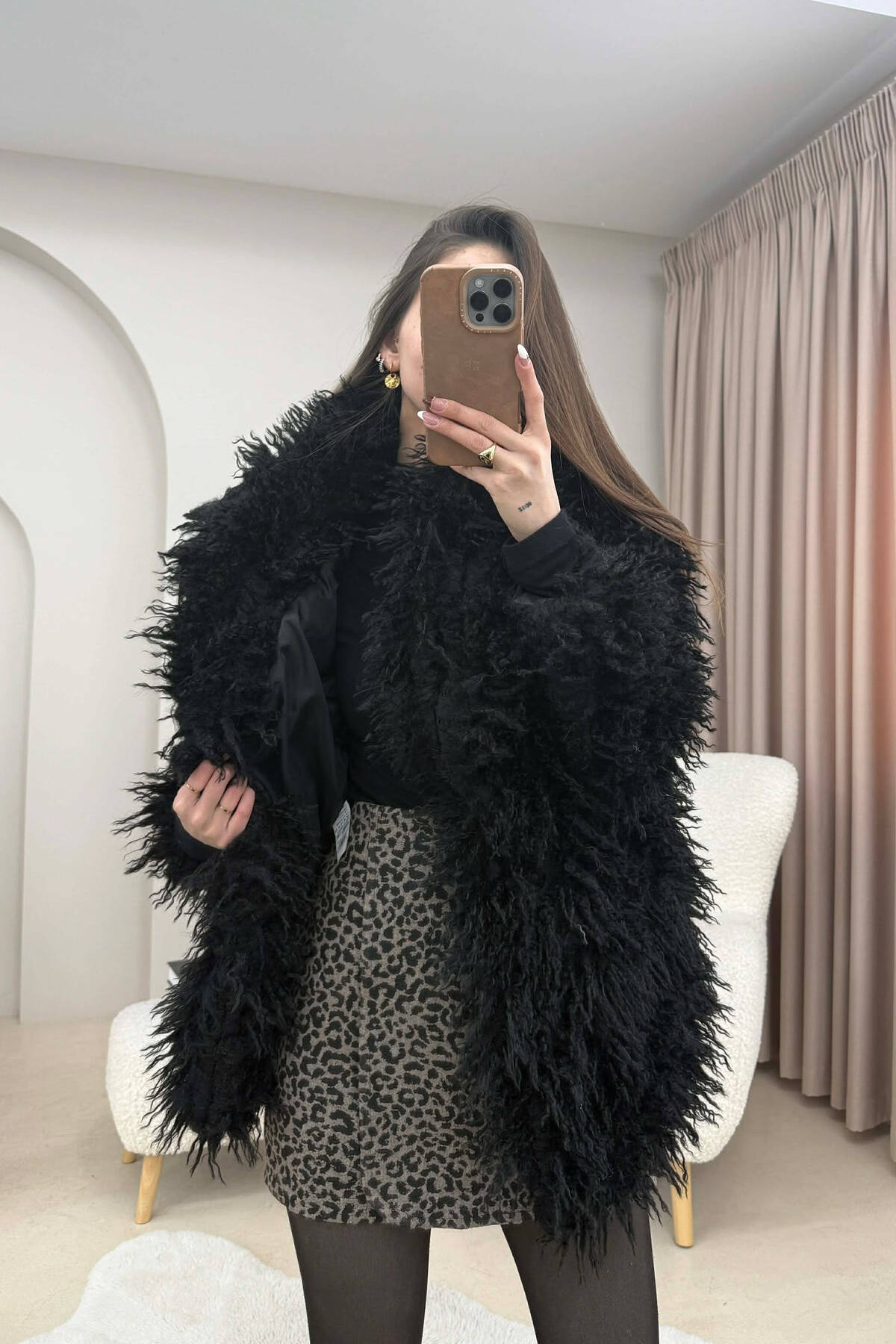 PALLTO PELLUSHI ME KAPUÇ DHE BUTONA PER FEMRA NE NGJYRE KAFE