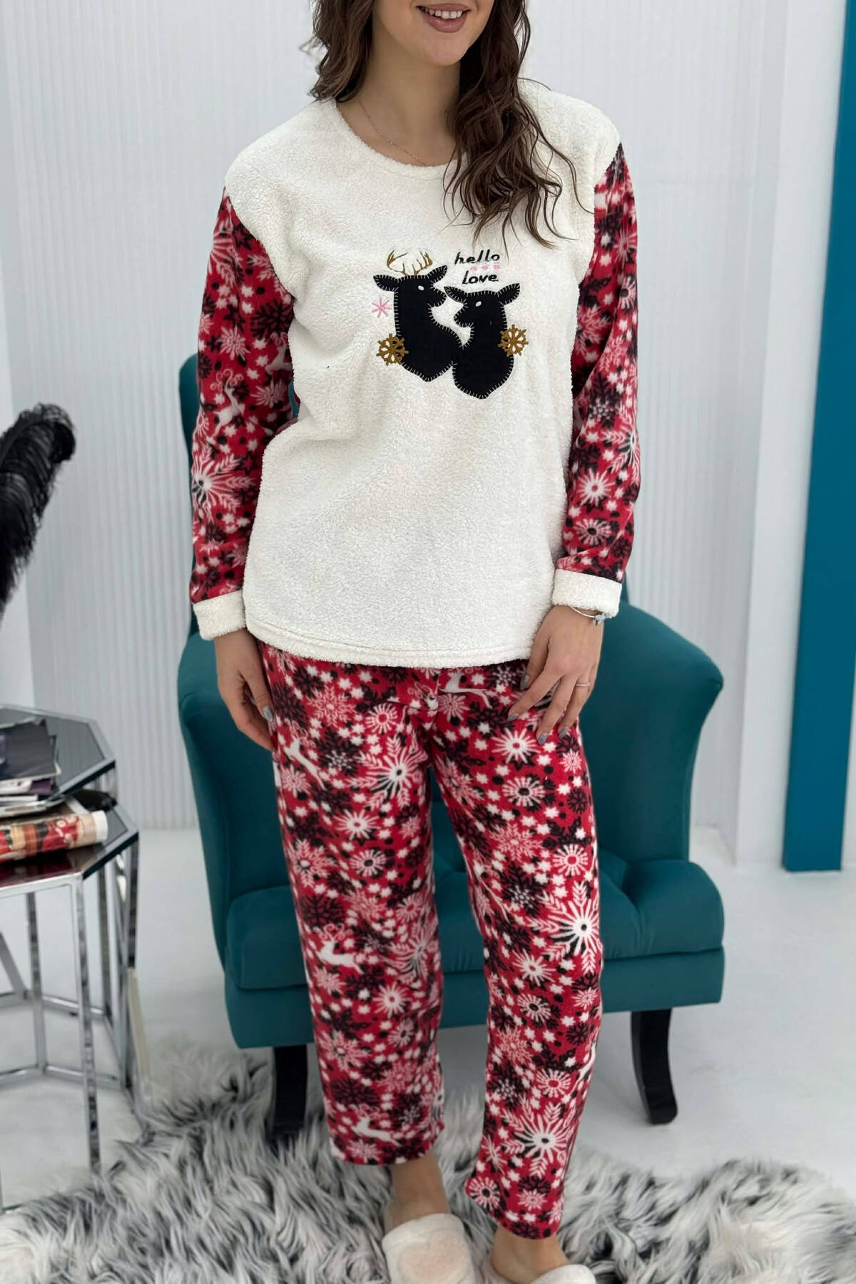 DEER FRONT IMAGE SWEATSHIRT+TROUSERS WOMEN PYJAMAS WHITE-E BARDHE