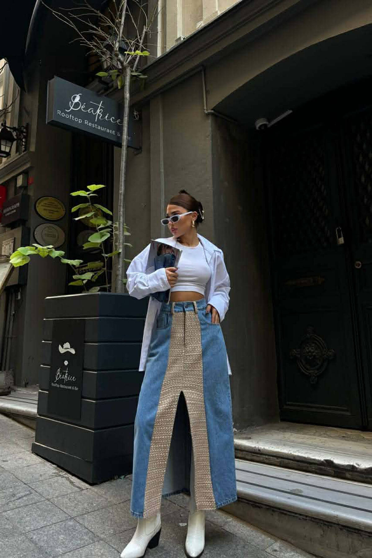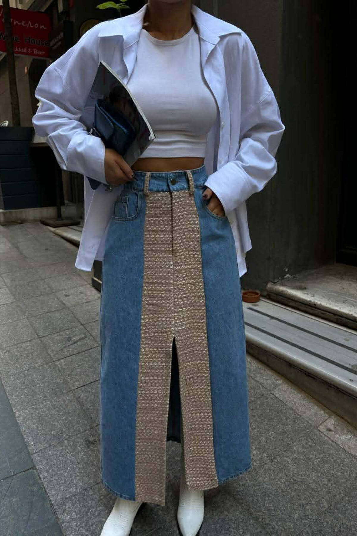 DENIM FRONT KNITTED DETAIL WOMEN SKIRT CREAM/KREM