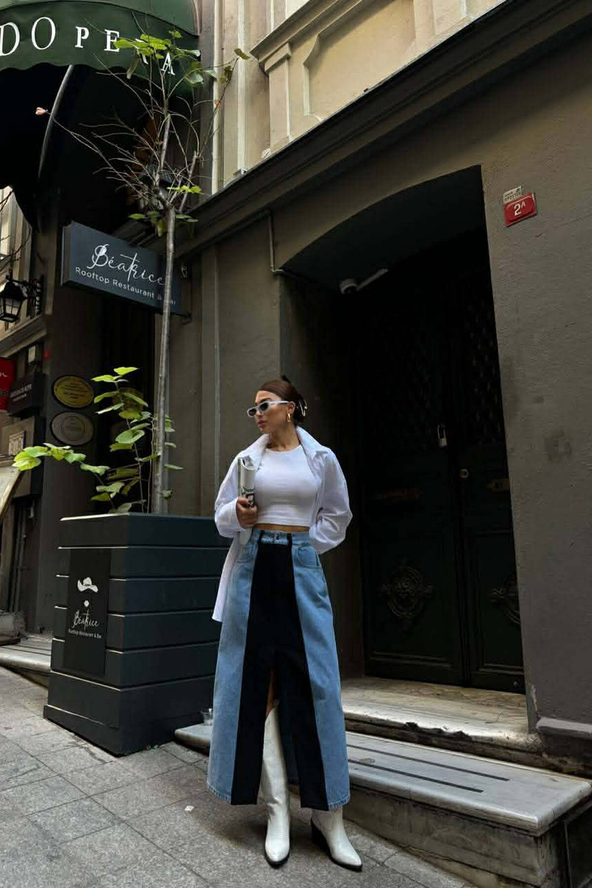 DENIM FRONT KNITTED DETAIL WOMEN SKIRT CREAM/KREM