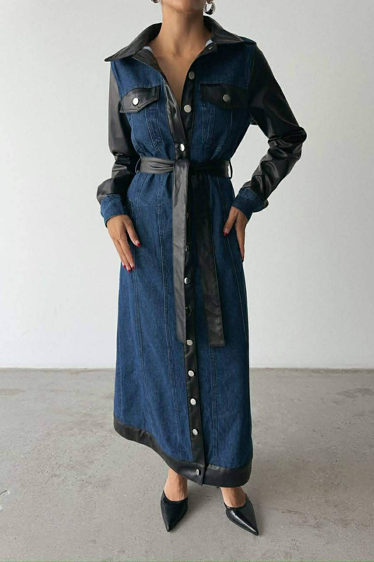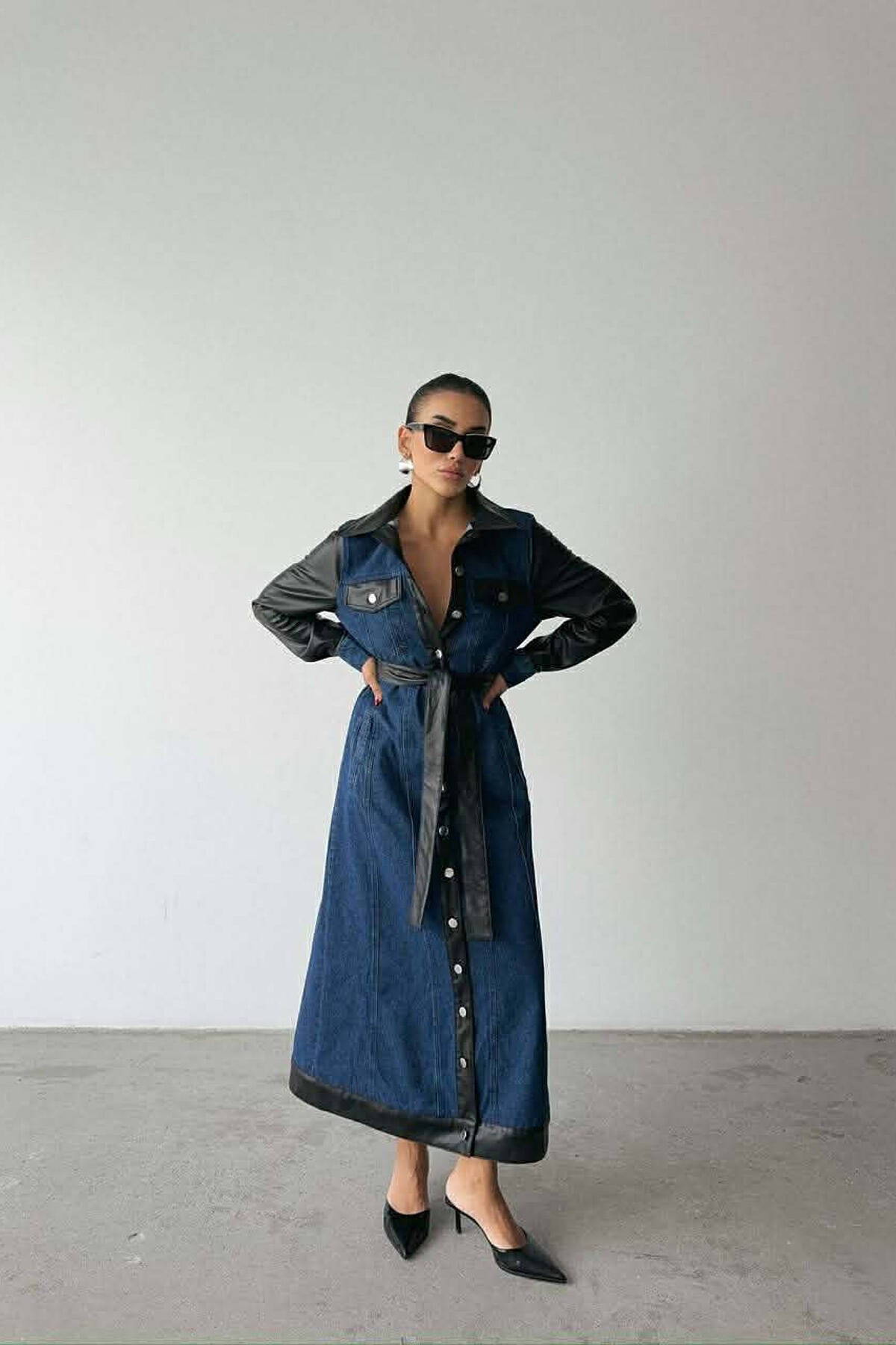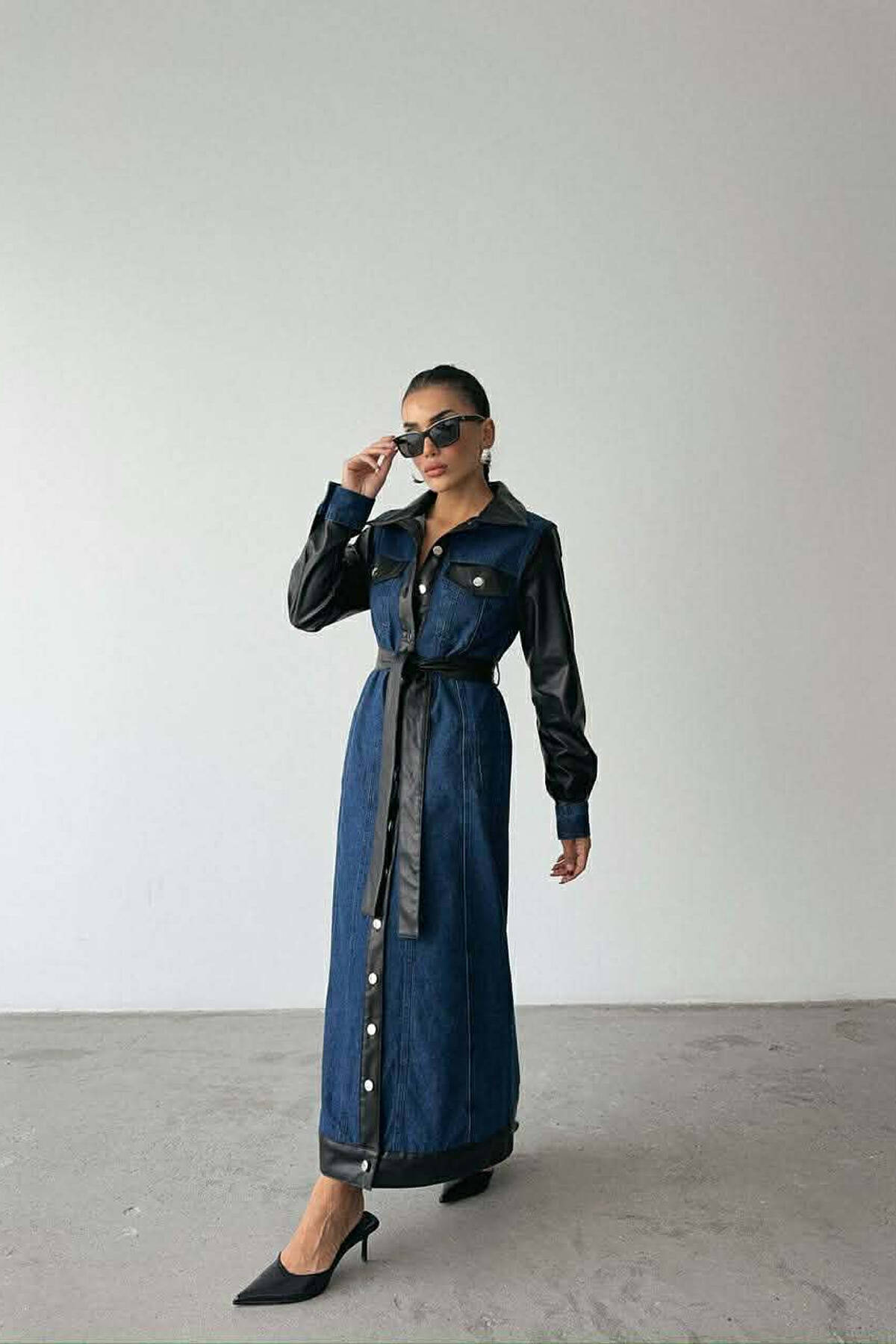 DENIM & LEATHER DESIGN LONG WOMEN DRESS BLACK-BLUE/ZEBL