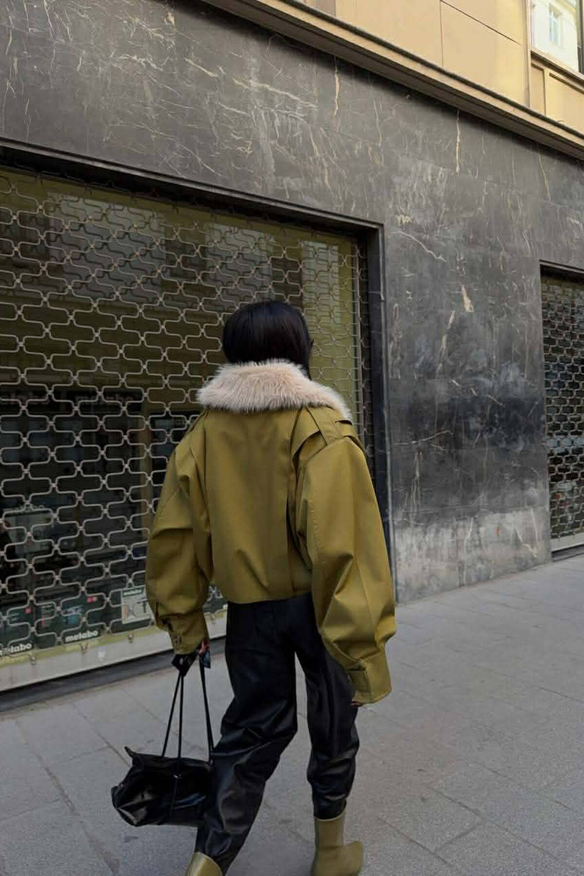DETACHABLE FAUX FUR ONE COLOR WOMEN JACKET OLIVE/ULLI