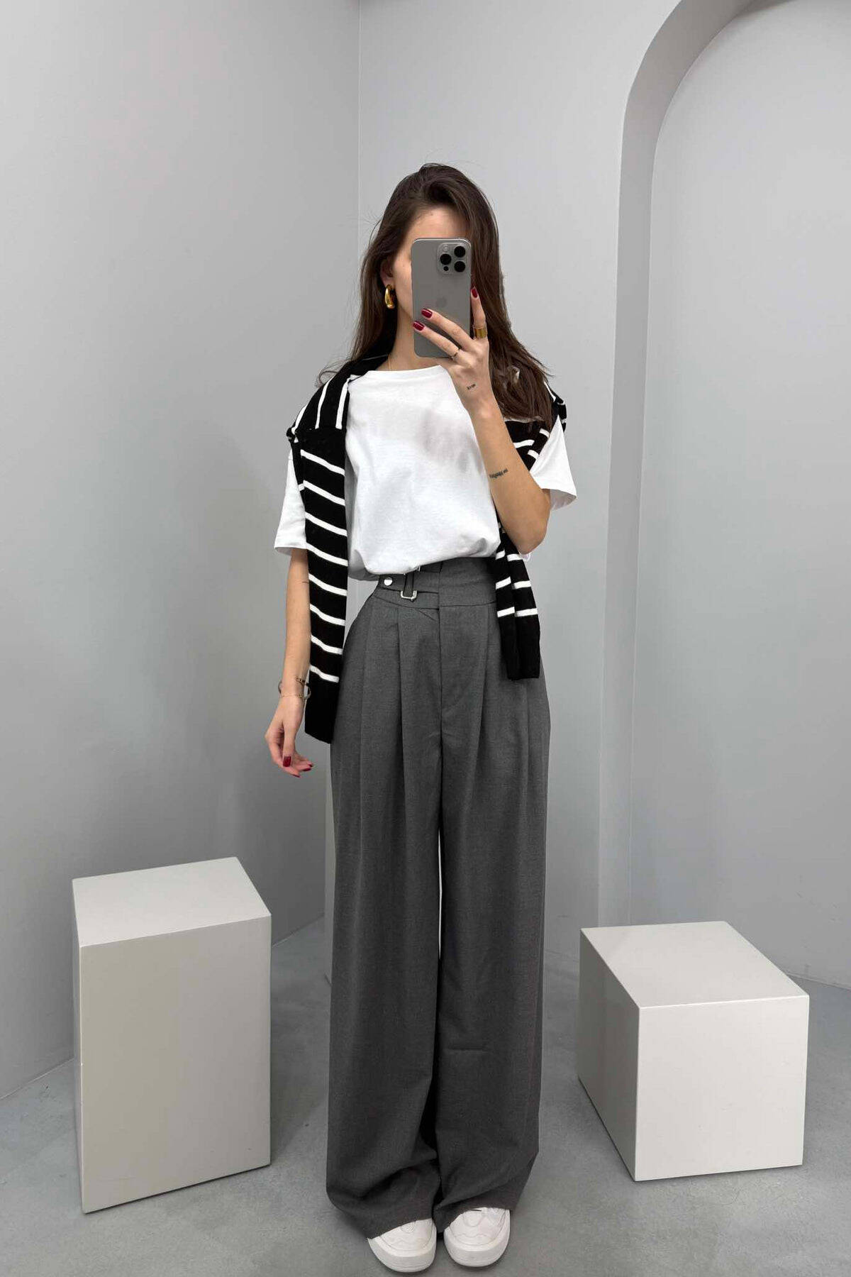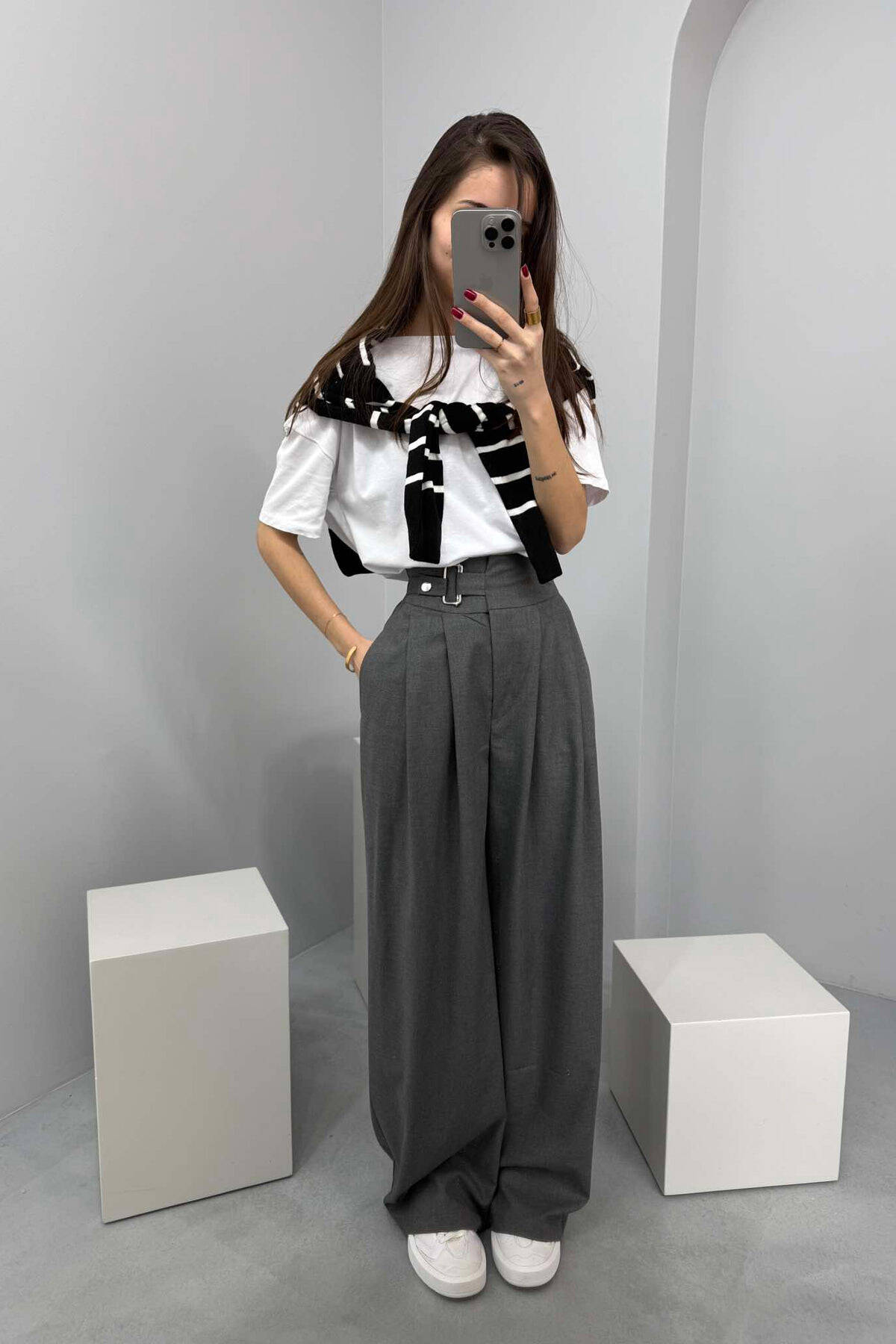 ONE COLOR BELT DETAIL WOMAN TROUSERS DARK GREY/GEE