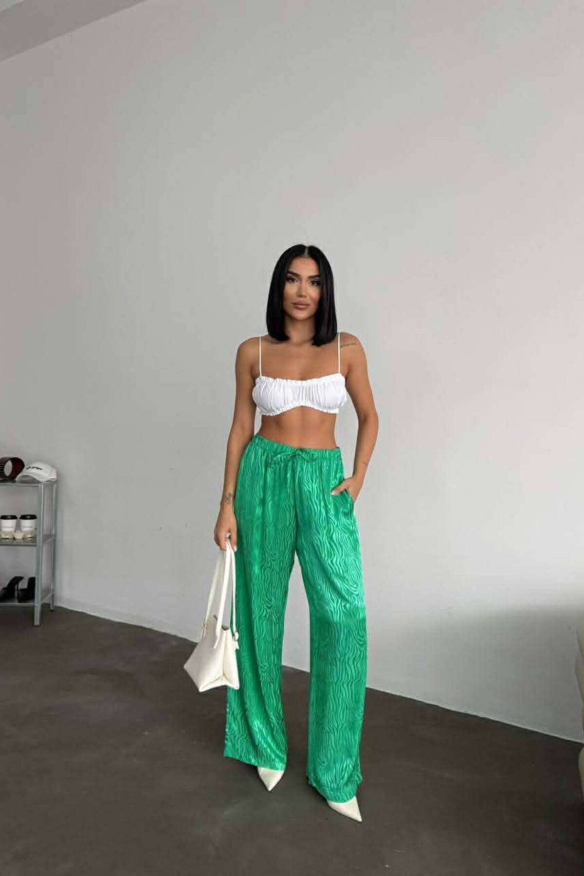 ELASTIC WAIST LACINGS DESIGNED WOMEN TROUSERS GREEN/JESHILE