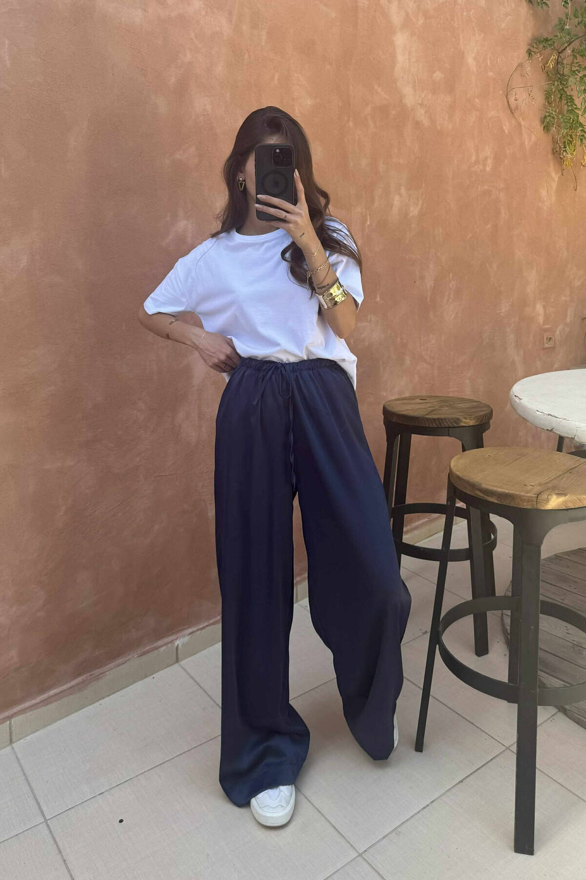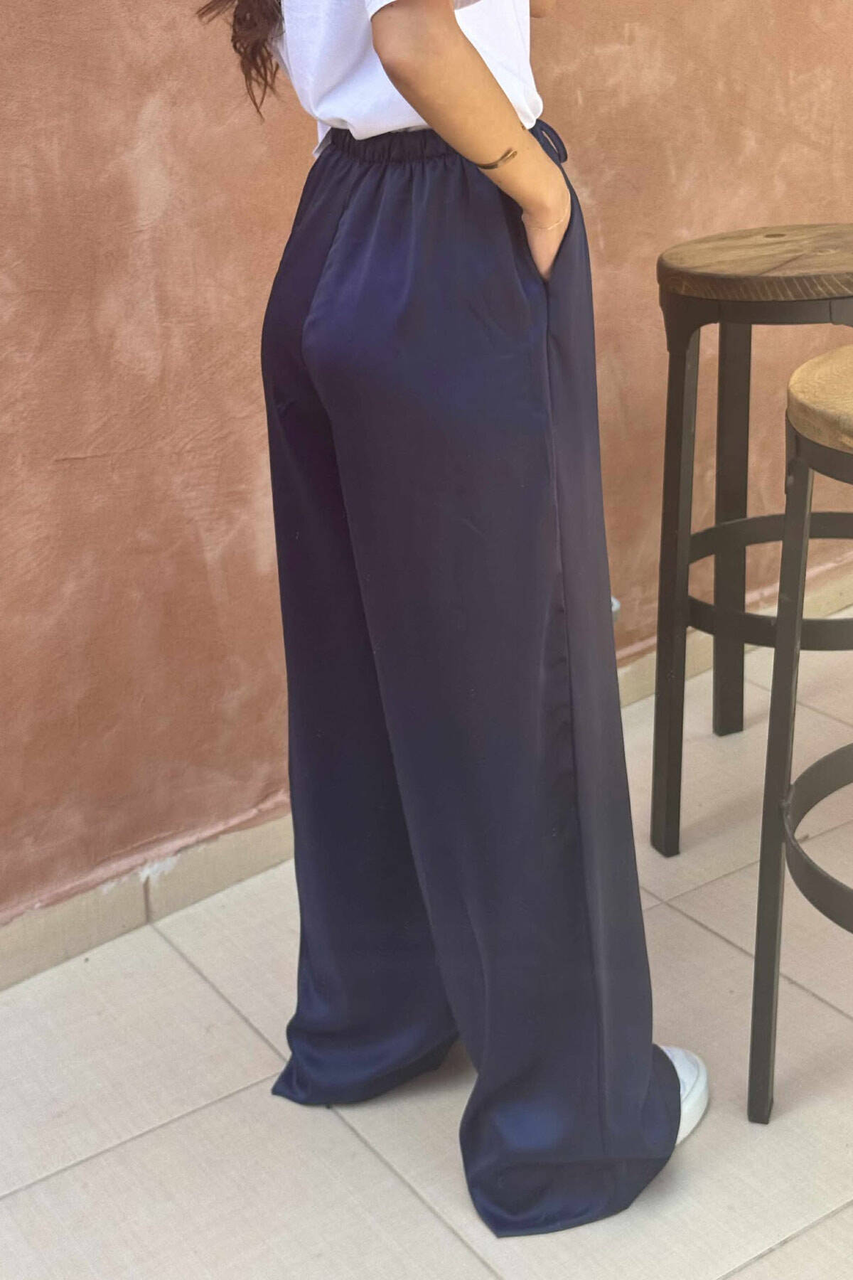 PANTALLONA SATEN ELASTIKE NË BELI DHE ME LIDHËSE PËR FEMRA NË NGJYRËN BLU E ERRËT