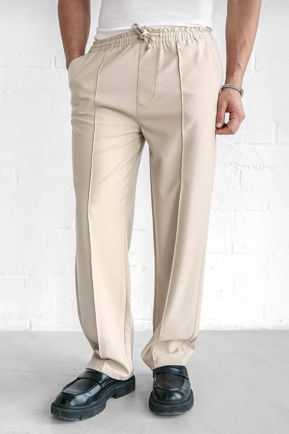 ONE COLOR LACING WAIST SIMPLE MEN PANTS BEIGE/BEZHE