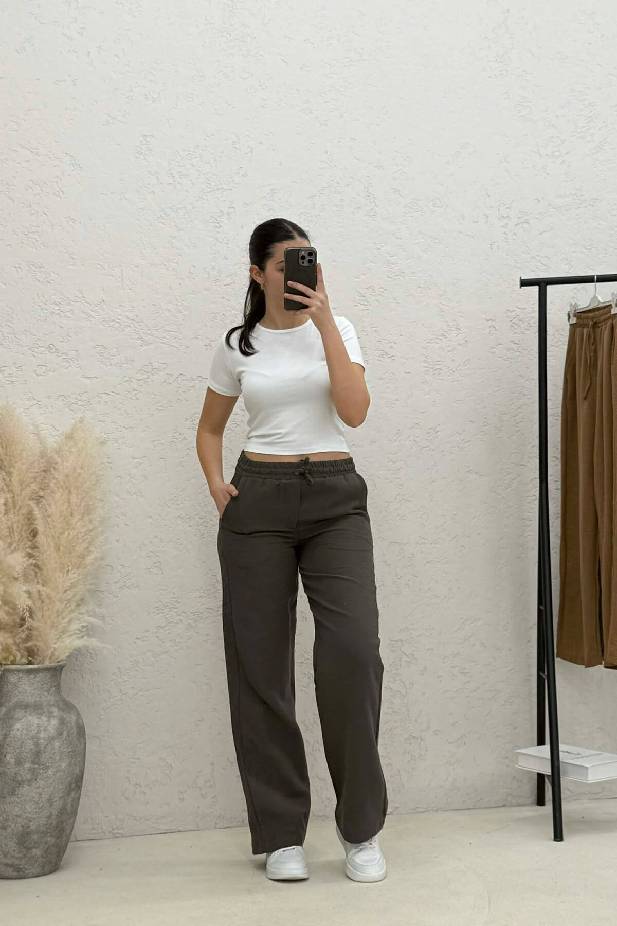 ONE COLOR WIDE LEG BELT DETAIL WOMAN TROUSERS DARK BROWN/KAE