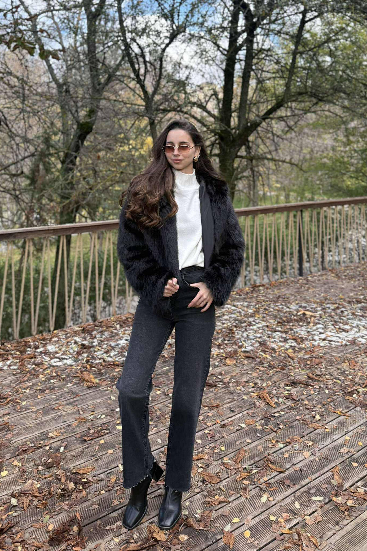 FAUX FUR HOODED WOMEN COAT BLACK/ E ZEZE