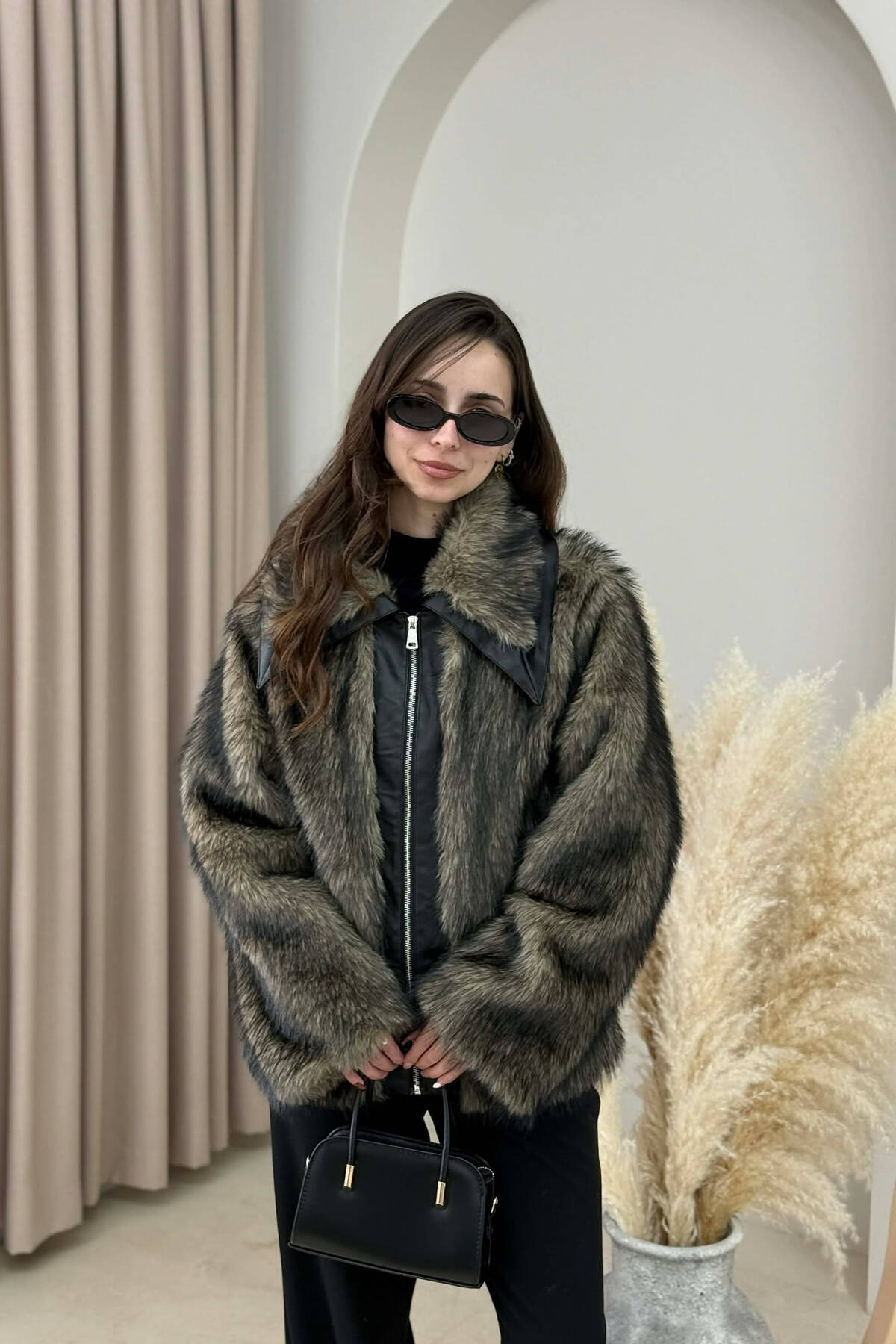 FAUX FUR ZIPPER WOMEN COAT BLACK-BROWN/ZEKA