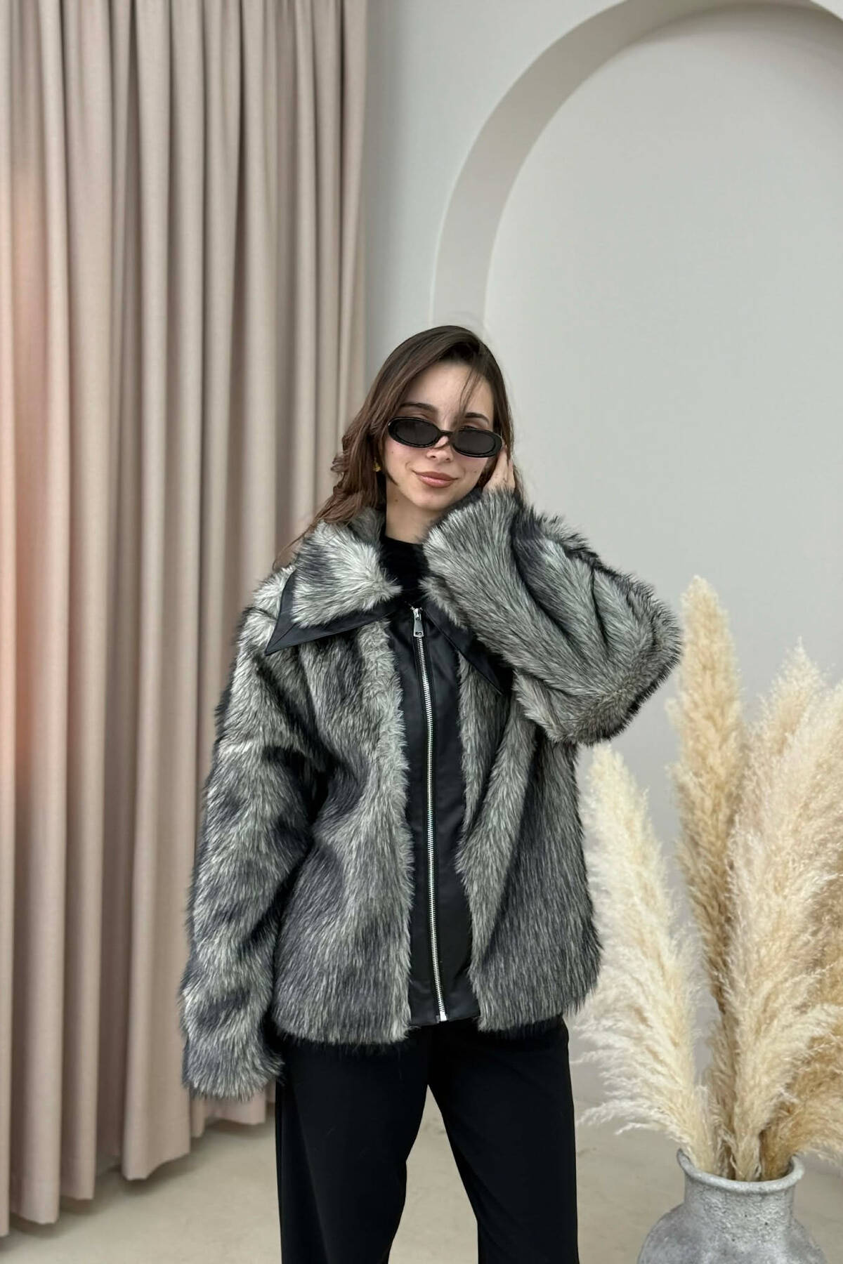 FAUX FUR ZIPPER WOMEN COAT DARK GREY/GEE