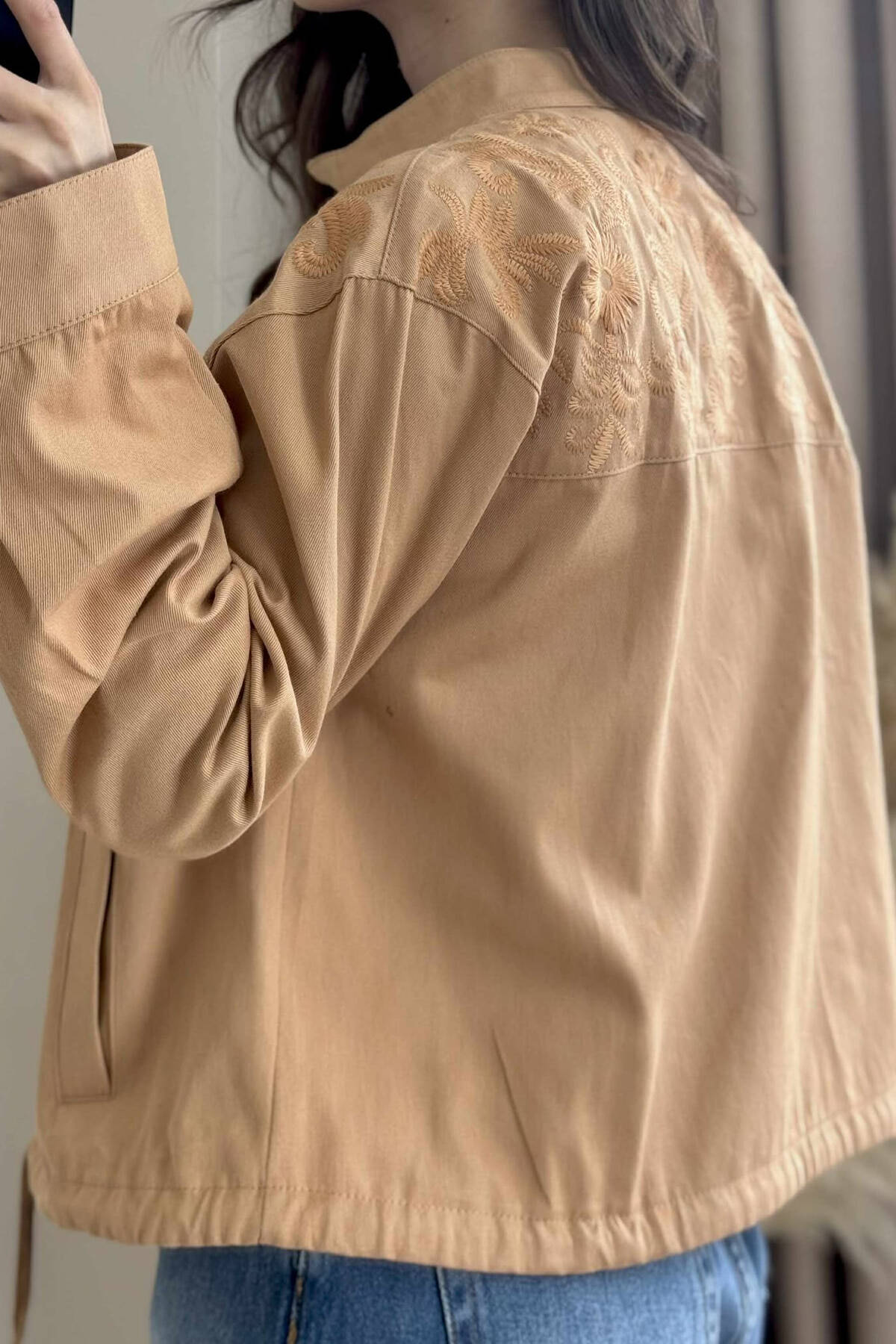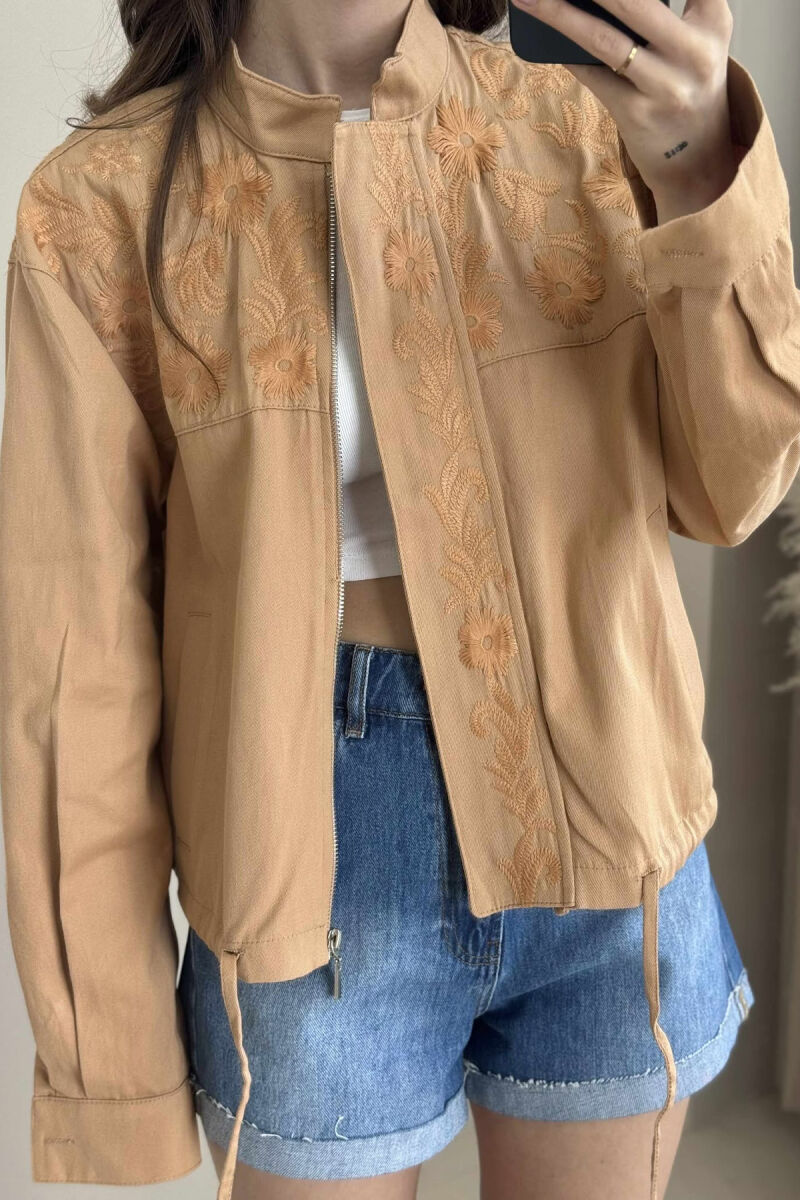 FLOWER DESIGN ZIPPER WOMEN JACKET LIGHT BROWN/KAZB